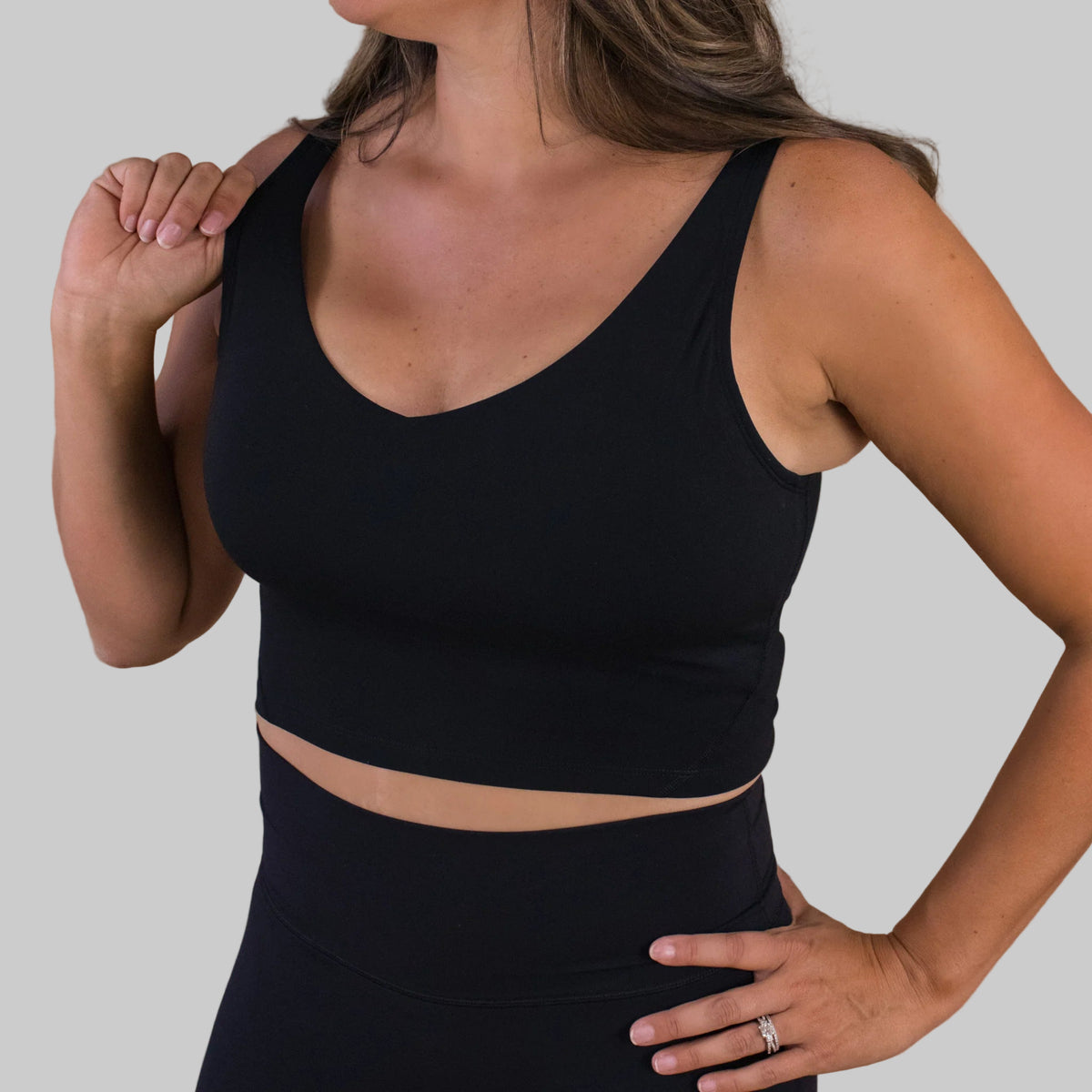 Get ready to fall for the Flex V-Neck Bra—your new go-to for yoga, workouts, and everything in between. This BLACK LABEL stunner features moisture-wicking fabric that keeps you cool and dry while feeling incredibly soft against your skin. The cropped silhouette hits just right above the waist, pairing perfectly with high-rise leggings, shorts, or jeans for an effortlessly chic vibe. Love customizing your support? Pop out the removable padding whenever you want. Available in A-D+ cup sizes with medium support, this bra is the perfect mix of comfort, style, and versatility that'll have you reaching for it again and again.
