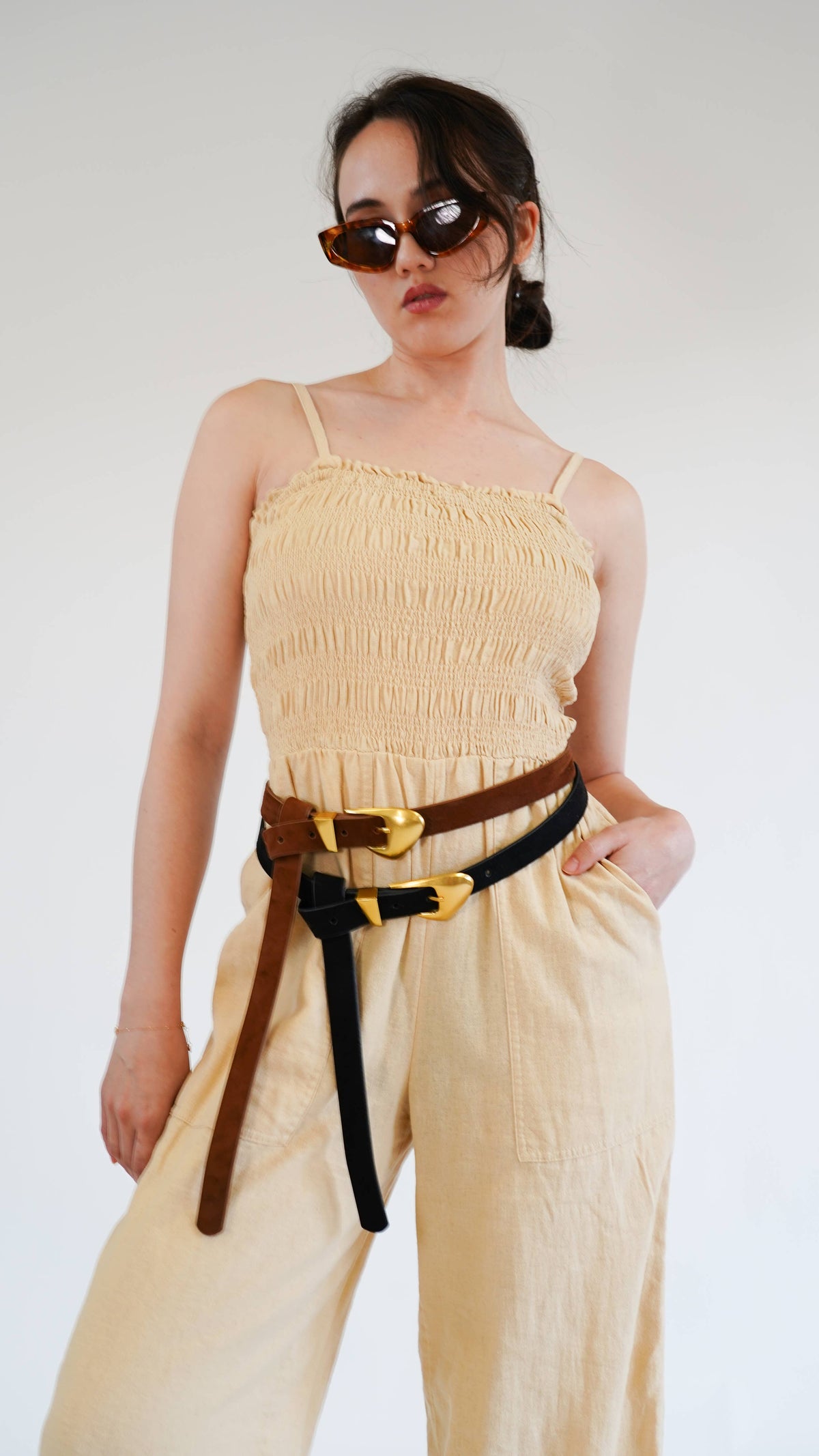 Add a playful twist to your look with our skinny suede belt featuring a sleek chubby buckle. Crafted from soft, luxurious suede, this belt offers a sleek, minimalistic silhouette with a bold buckle that adds personality to any outfit. The adjustable length allows for versatile styling options—tie it at the end for a laid-back, chic vibe or wear it traditionally for a more polished look.