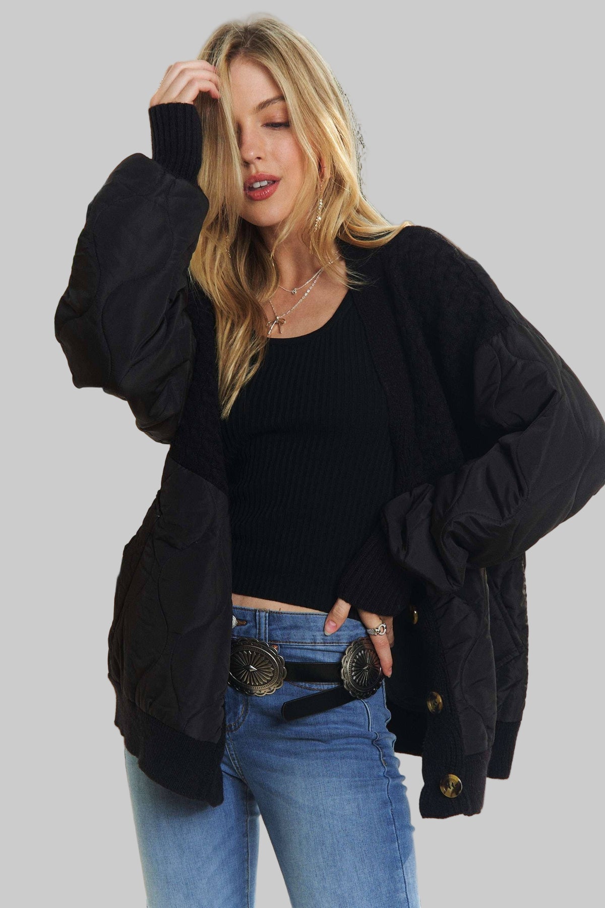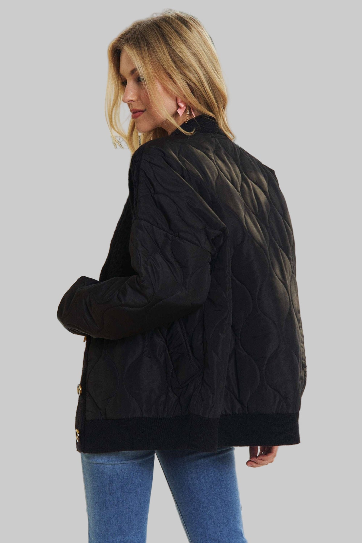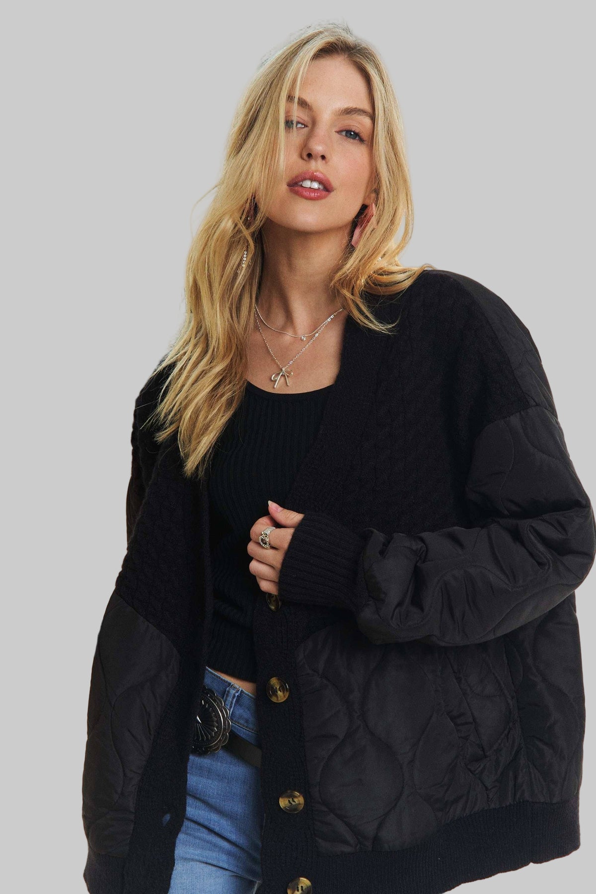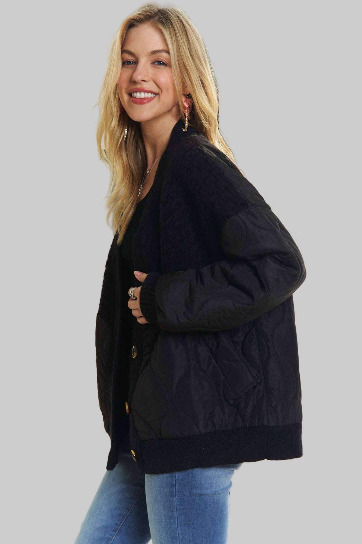 Button Down Quilted Cardigan With Sweater Knit