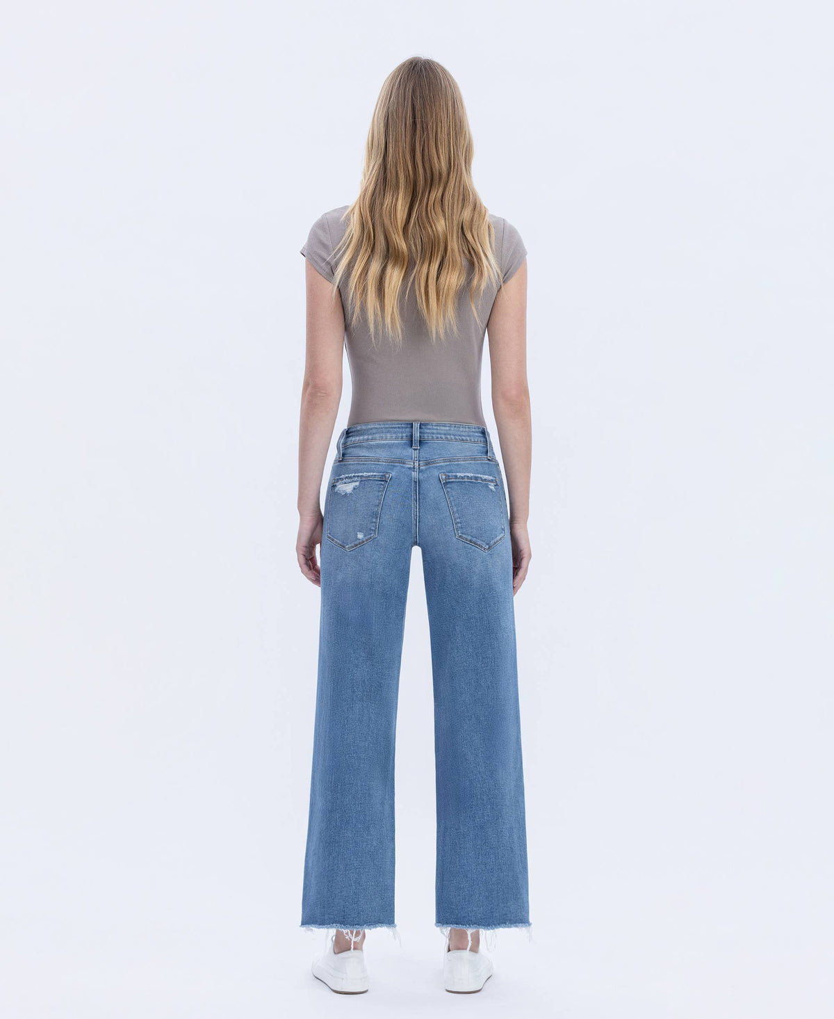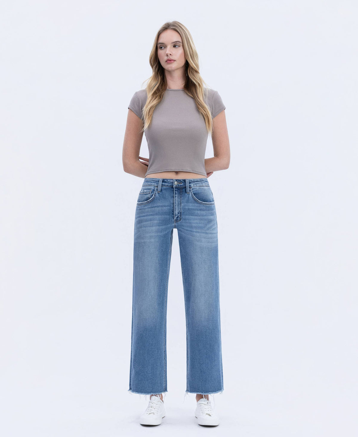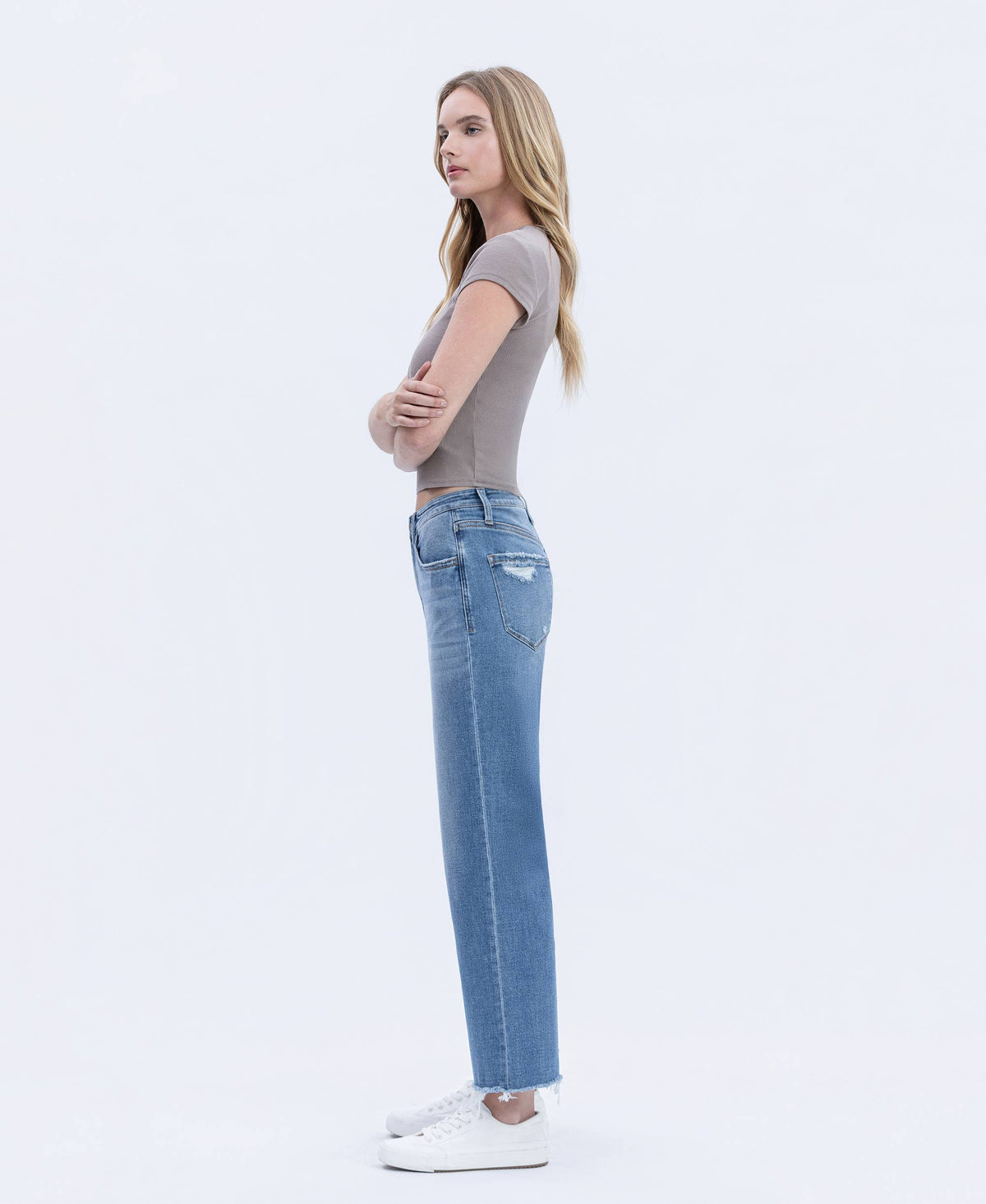 High Rise Medium Wash Ankle Dad Jeans - Comfort stretch denim, high rise waist, 5 pockets, distressed detail, raw hem, ankle length, medium wash, dad jeas. Rise: 10" / Inseam: 28" / Leg Opening: 18 1/2" / Model is 5'10" wearing a size 26