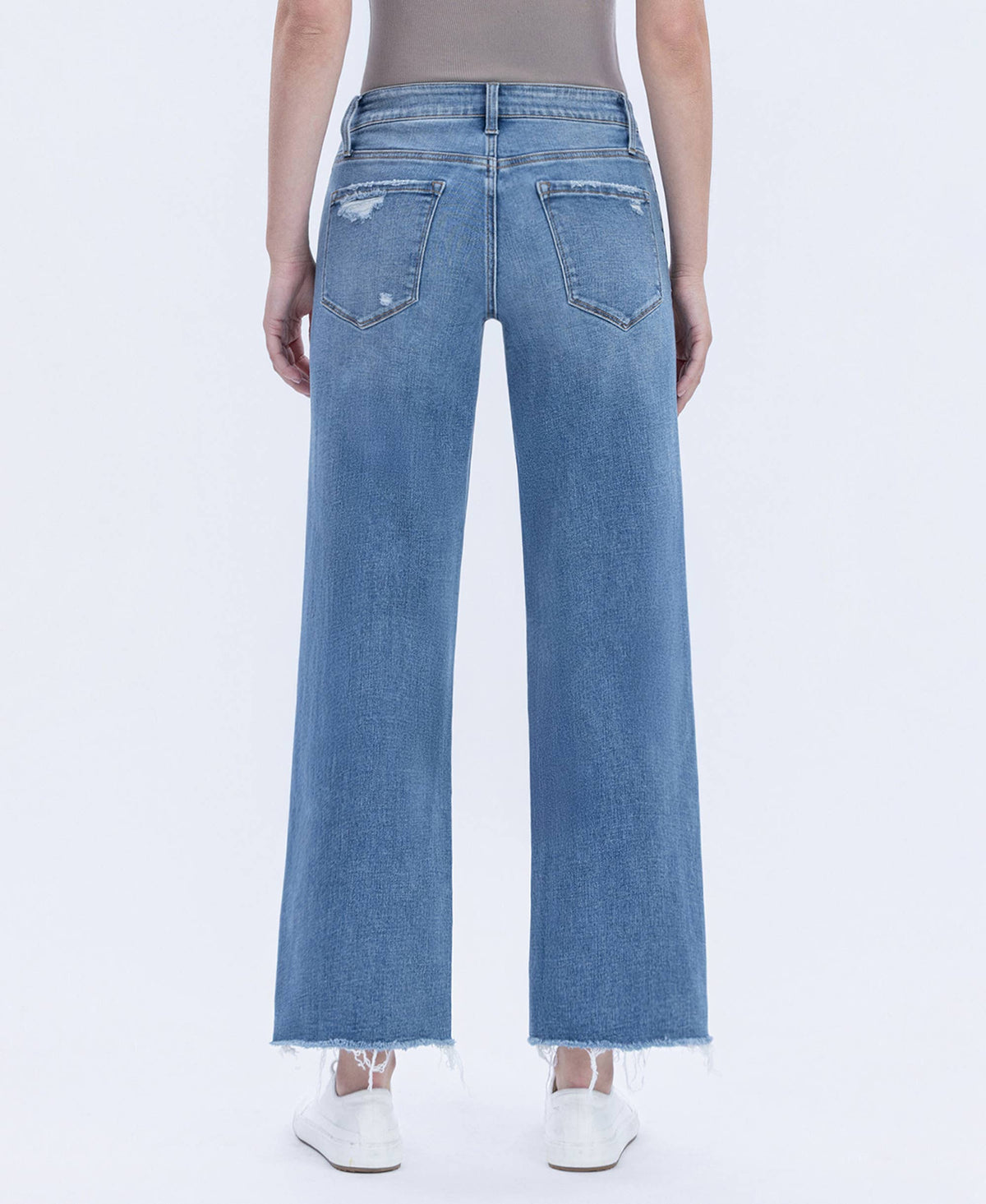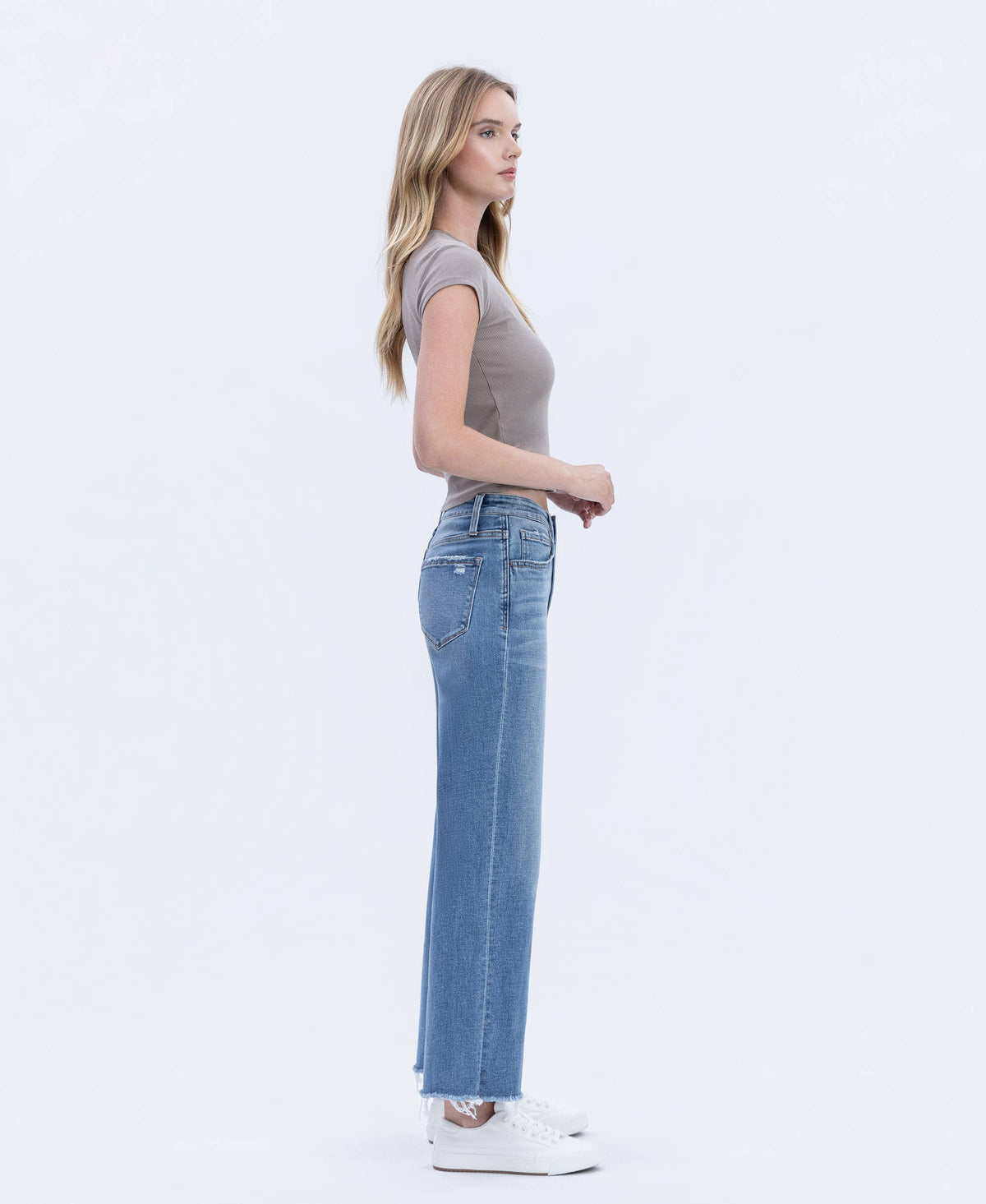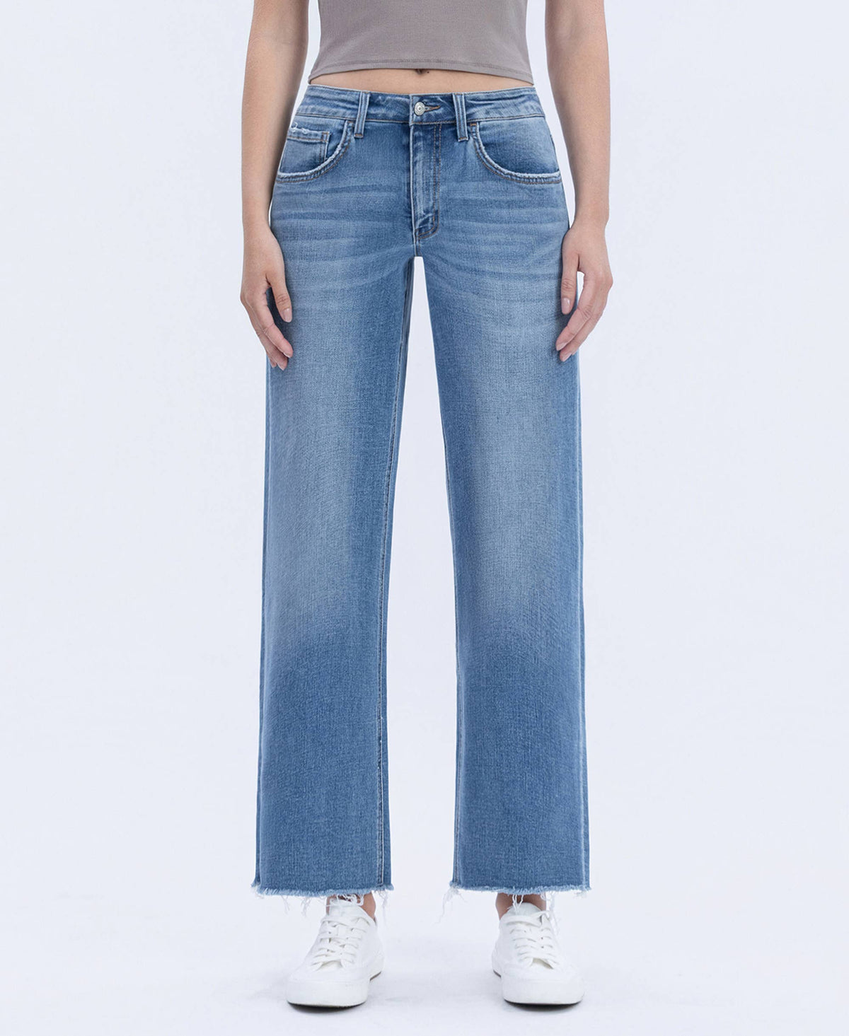 High Rise Medium Wash Ankle Dad Jeans - Comfort stretch denim, high rise waist, 5 pockets, distressed detail, raw hem, ankle length, medium wash, dad jeas. Rise: 10" / Inseam: 28" / Leg Opening: 18 1/2" / Model is 5'10" wearing a size 26