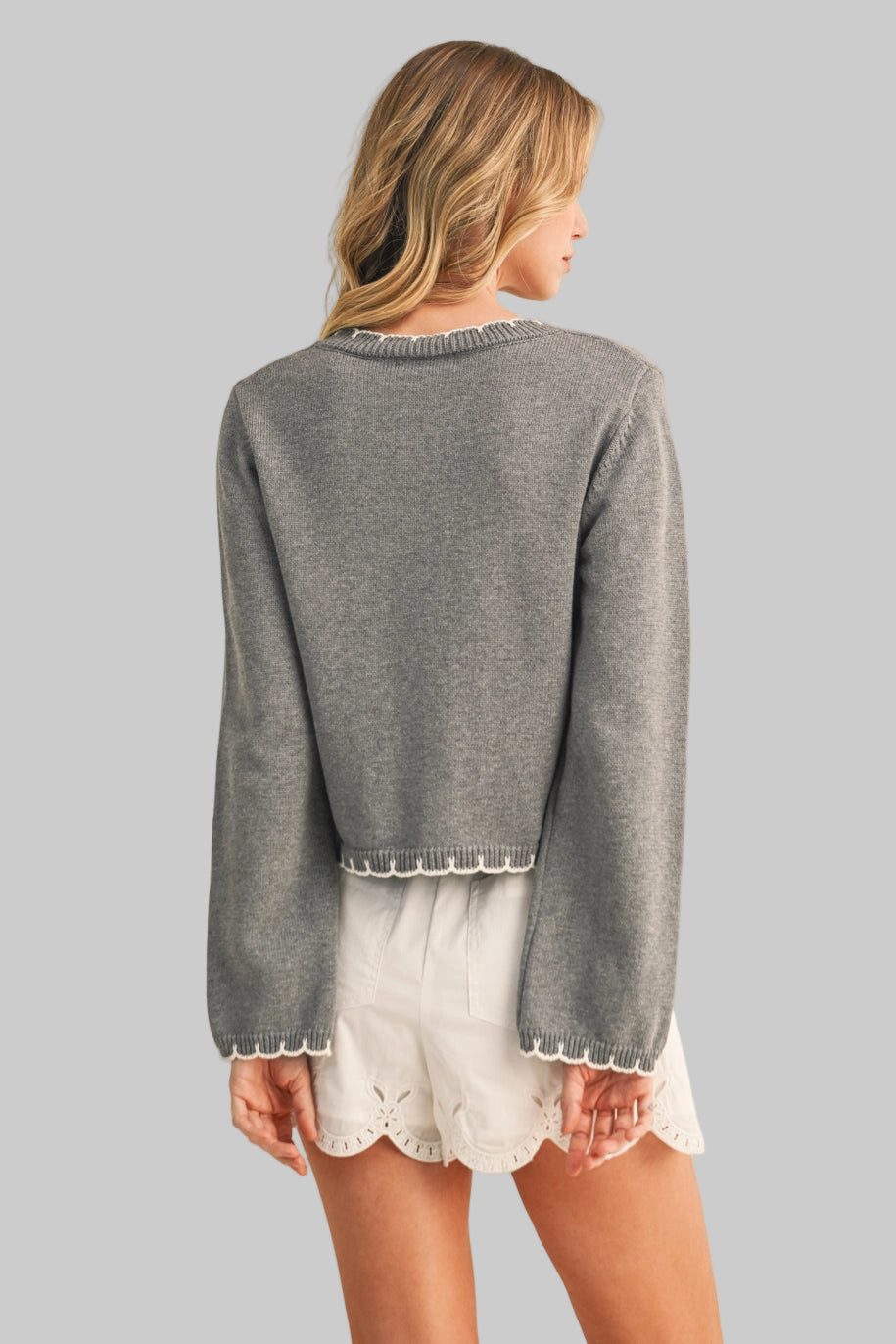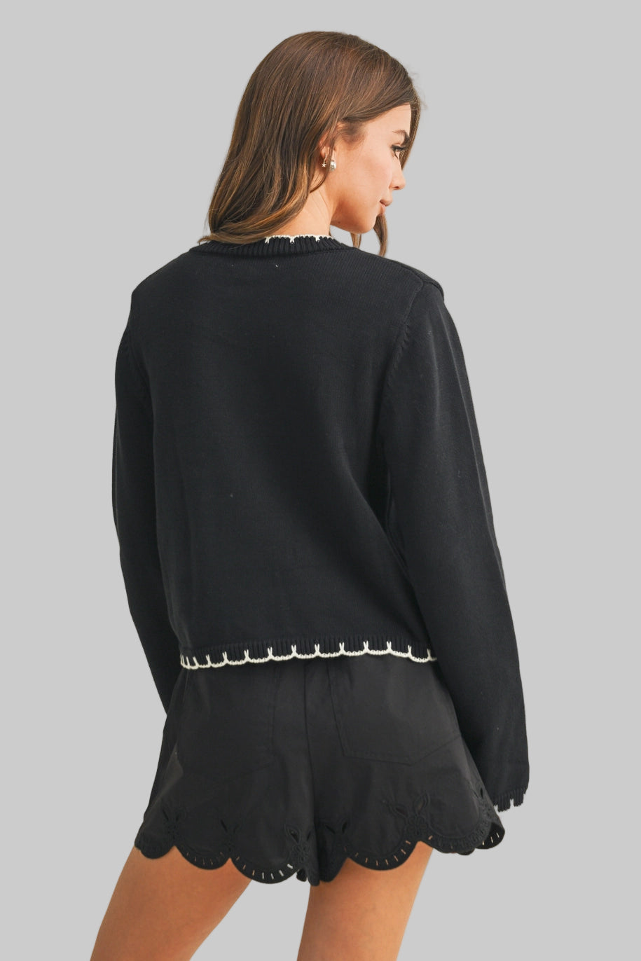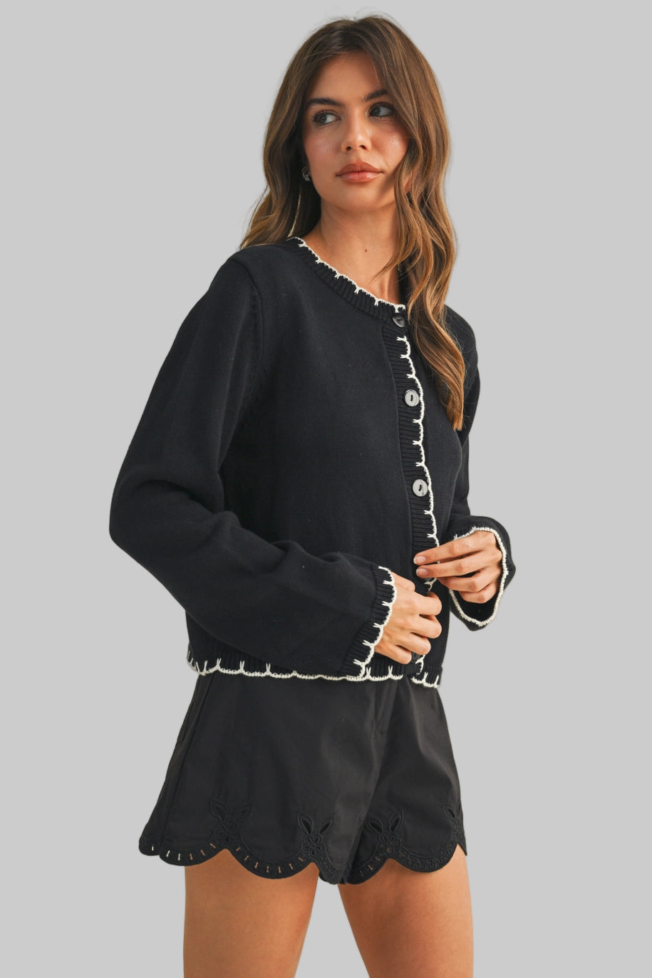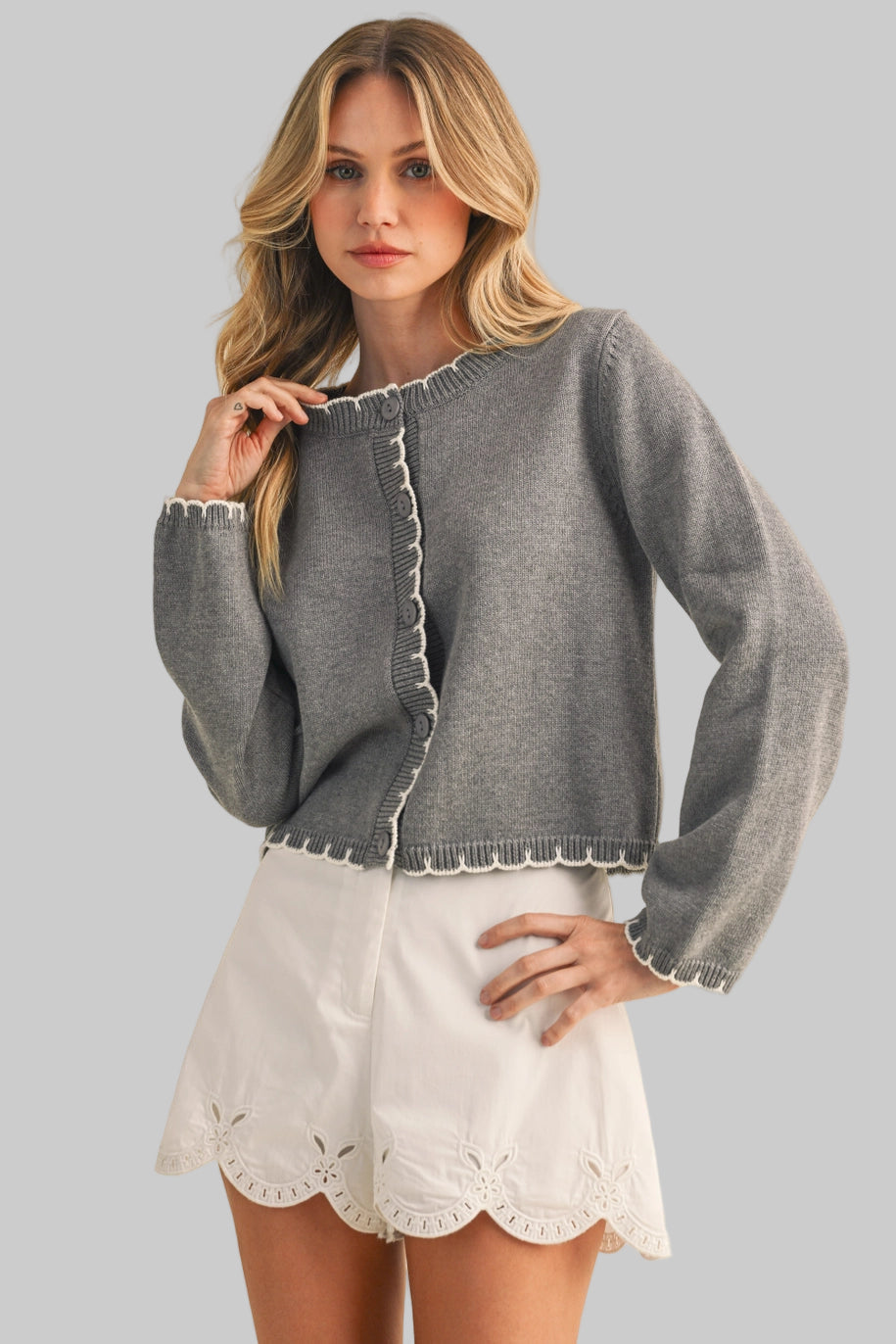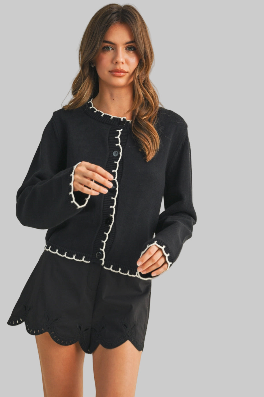 Snuggle into softness with this delightfully scalloped cardigan, available in Black & Ivory or Gray & Ivory. The charming button-front closure and flowing long sleeves make it the perfect companion for layering or standalone wear. Whether you're dressing up a casual look or adding warmth to your favorite outfit, this cardigan brings a whimsical flair and all-day comfort to your wardrobe. Your new favorite piece is just waiting to be discovered.