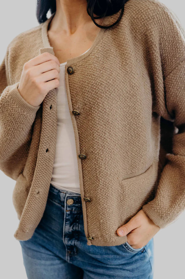 Slip into effortless sophistication with this textured knit cardigan that's ready for anything. Featuring a charming round neckline and gleaming brass buttons, it's the kind of piece that makes you feel put-together without trying too hard. The thoughtfully placed front pockets? Pure genius for keeping your essentials close. Made from a smart blend of acrylic, polyester, and polyamide, this cardigan strikes the perfect balance between durability and buttery softness, with just enough stretch to move with you throughout your day. Whether you're layering over your favorite tee or throwing it on over a dress, this timeless wardrobe essential delivers style and substance in one cozy package.Point of Sale