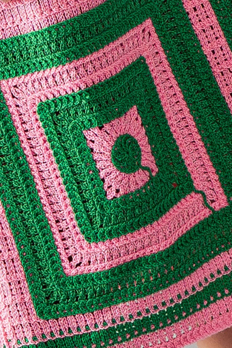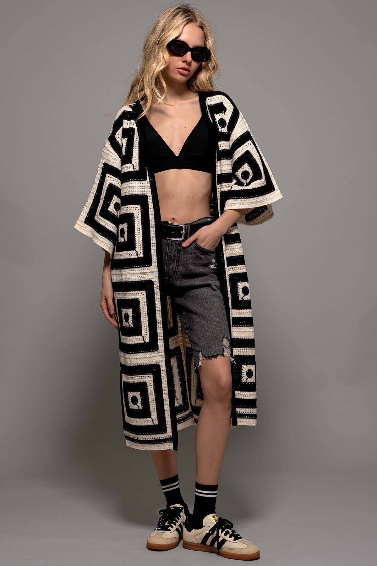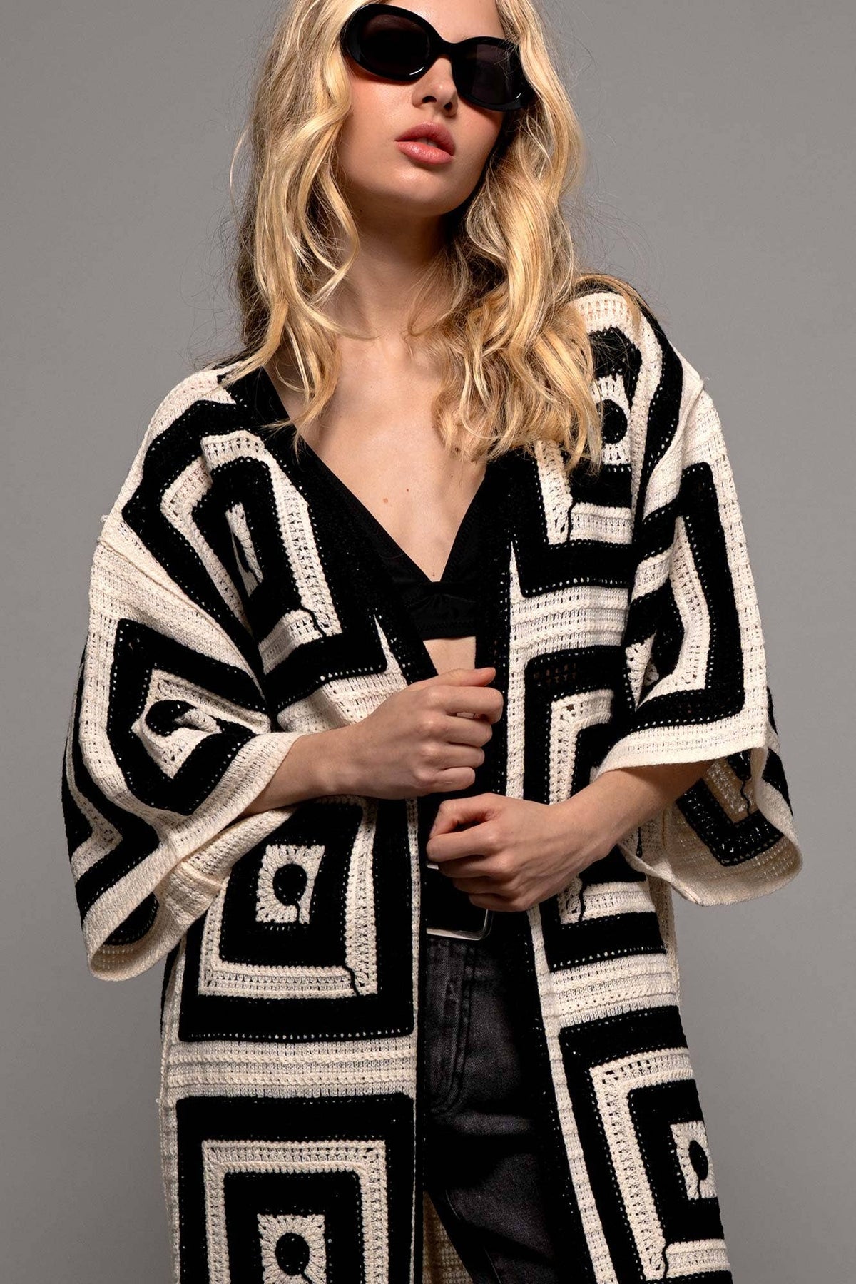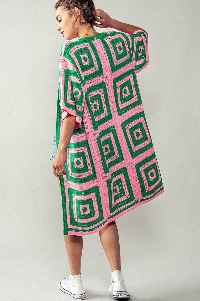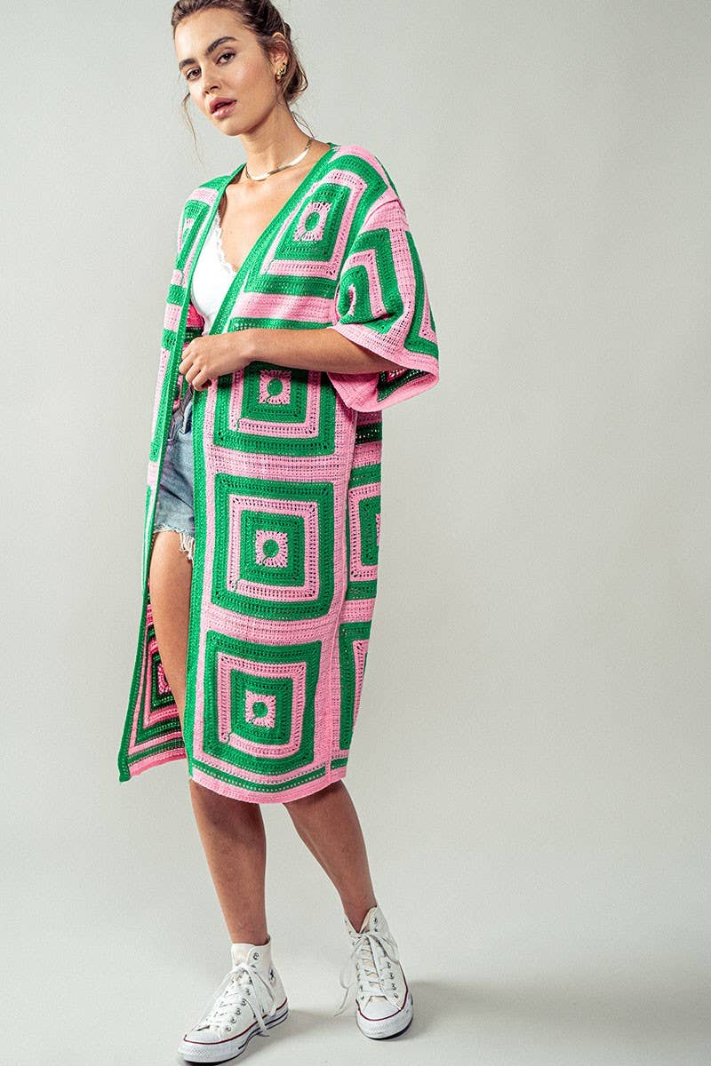 This striking cardigan features a bold geometric square pattern in premium crochet knit construction. The midi length and relaxed kimono sleeves create an effortless layering piece with artisanal-inspired charm. Features: • 100% Acrylic • 1PK: 6PC • Bold geometric crochet pattern • Relaxed kimono sleeves • Open front design • Midi length • Made in China