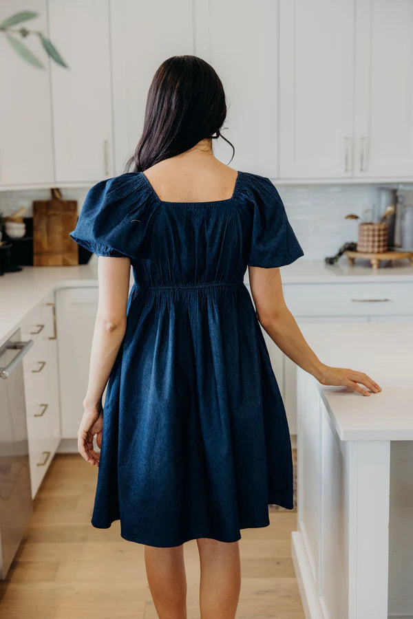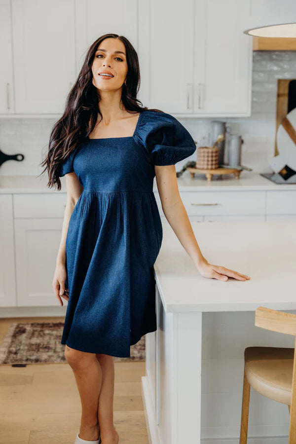 The Jack Dress combines classic style with practical comfort, featuring a knee-length cut crafted from a durable cotton-poly blend that mimics the look of denim. Its puff sleeves add a refined, structured silhouette, while built-in pockets offer convenient storage without compromising the dress’s sleek design. Ideal for a polished yet effortless appearance.