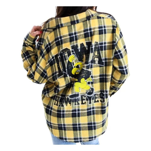 Get cozy and show your Hawkeyes pride with the Iowa Dunn Dream! This oversized yellow and black plaid shirt features the iconic Iowa Hawkeyes logo on the back—perfect for layering up during those crisp fall games at Kinnick. Stay warm, stylish, and spirited while cheering on your team in comfort!