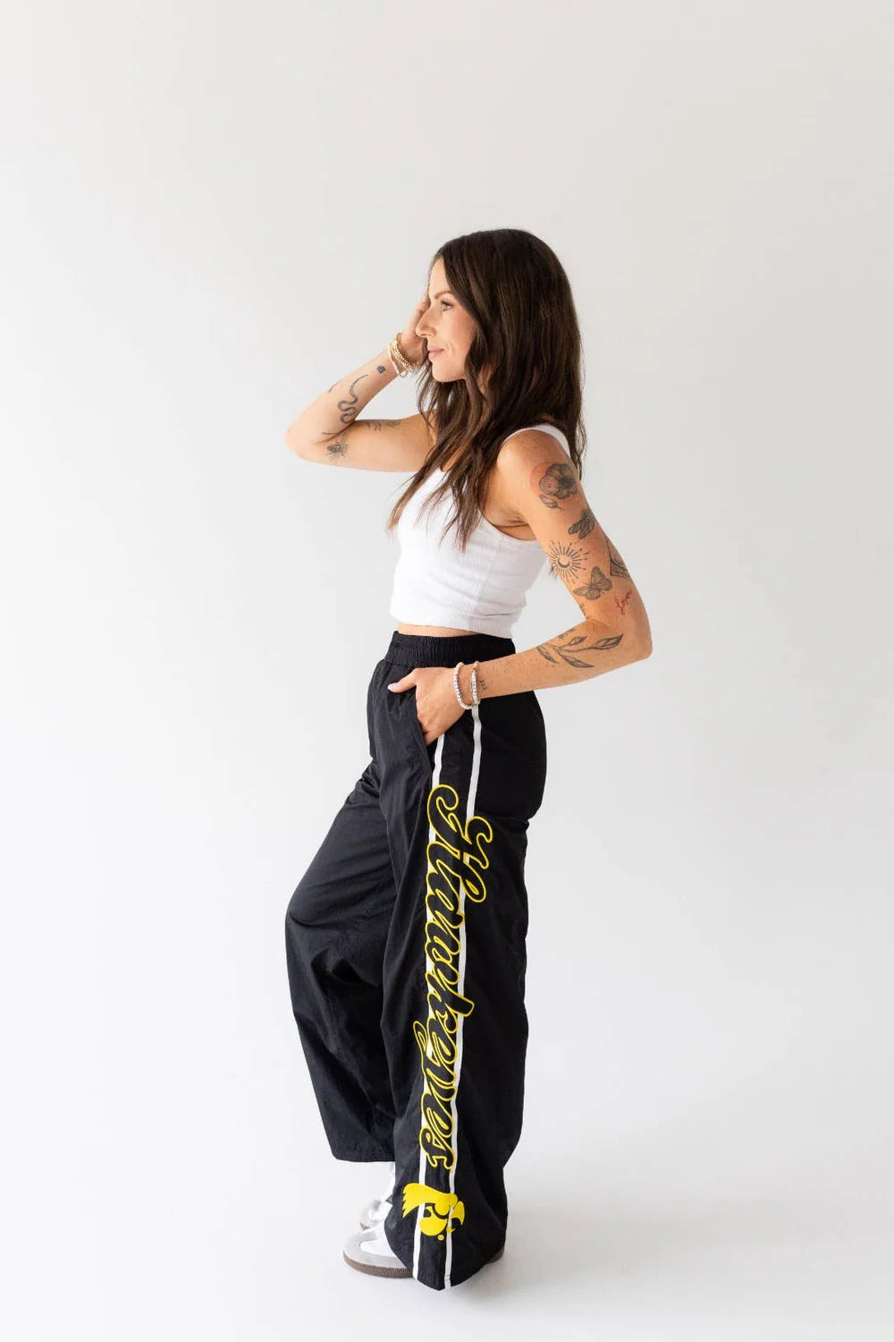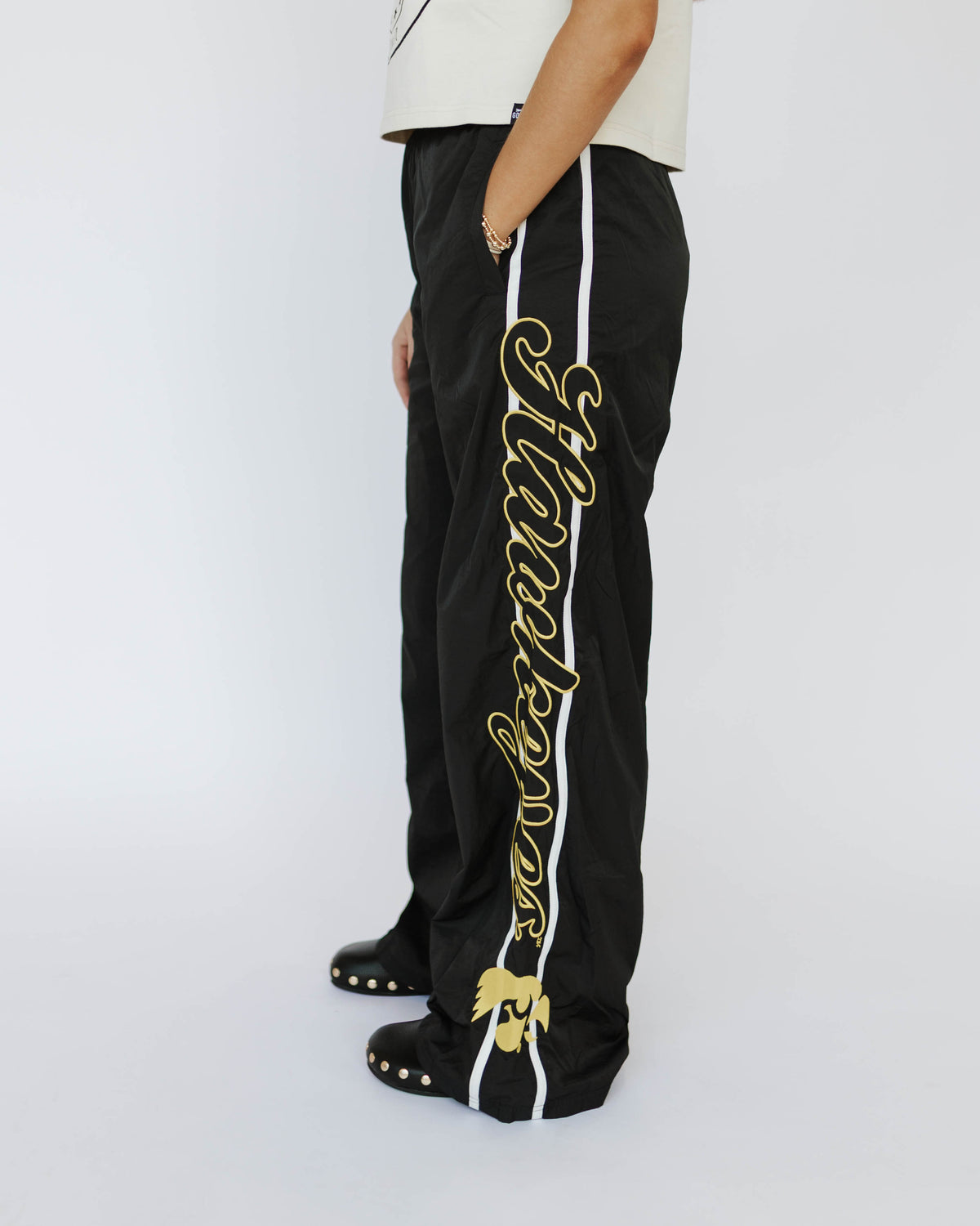 Bold, sporty, and made to stand out. These elevated track pants bring the energy. With a high-rise fit, wide-leg silhouette, and eye-catching side details, they’re perfect for game day or everyday. Finished with a comfy elastic waistband and lightweight feel.