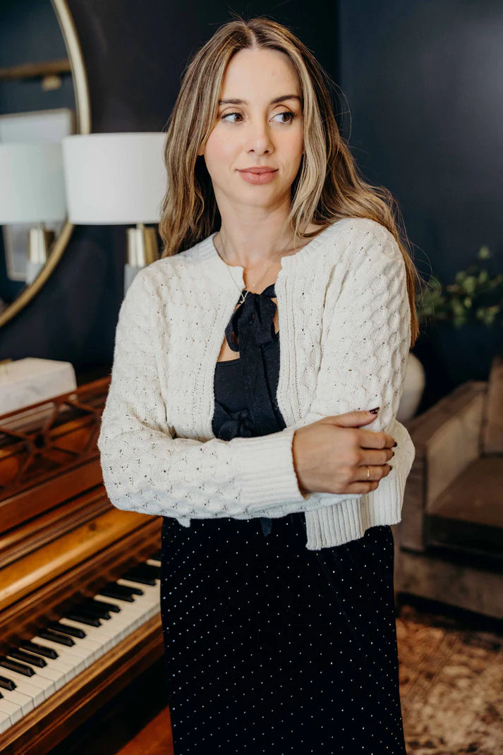 Wrap yourself in cozy charm with this delightful long-sleeve cardigan featuring intricate cable knit detailing and charming velvet ties at the neckline. The relaxed round neckline adds a touch of effortless style, while the soft polyester fabric keeps you comfortable all day long. Perfect for layering over your favorite outfits with a hint of whimsy and warmth.