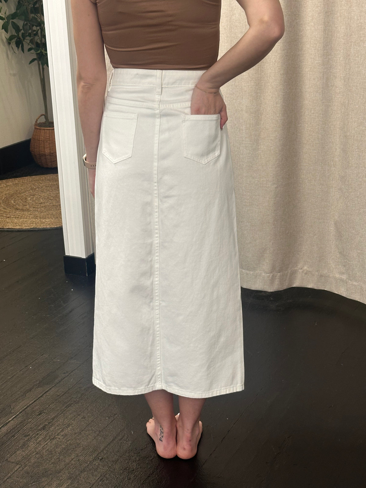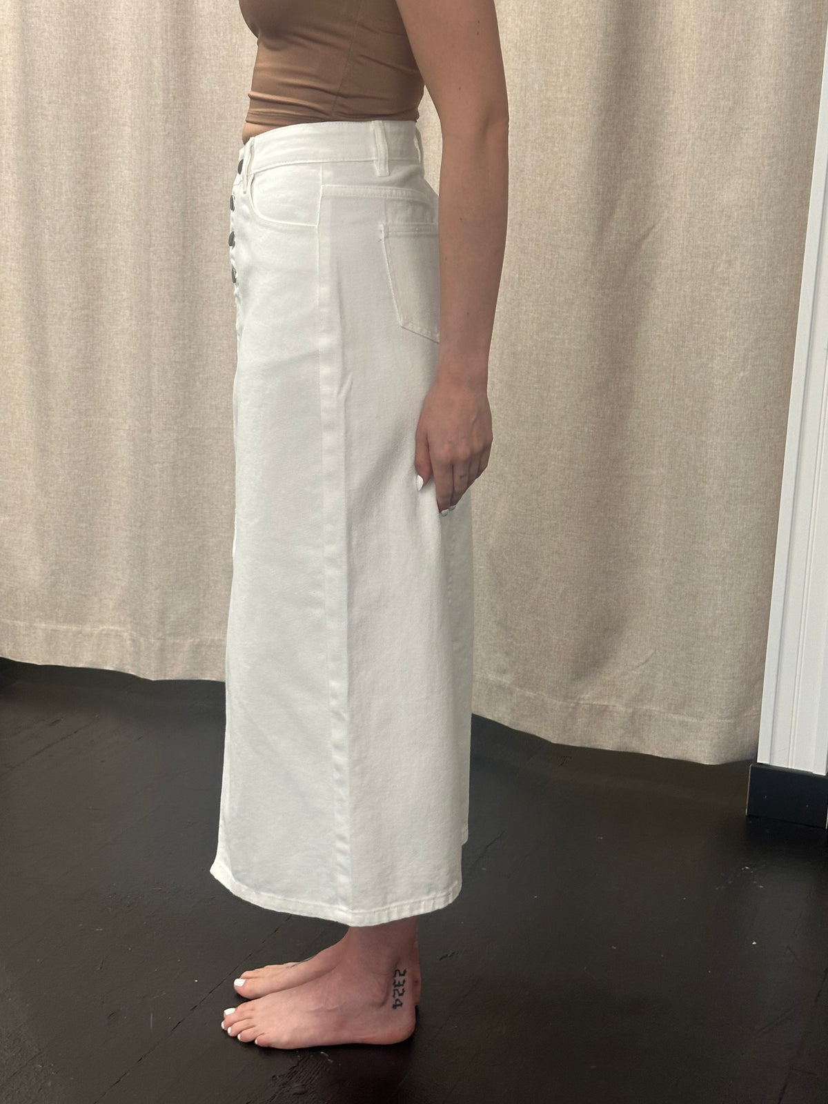 Maxi denim white skirt with 4 silver button fly