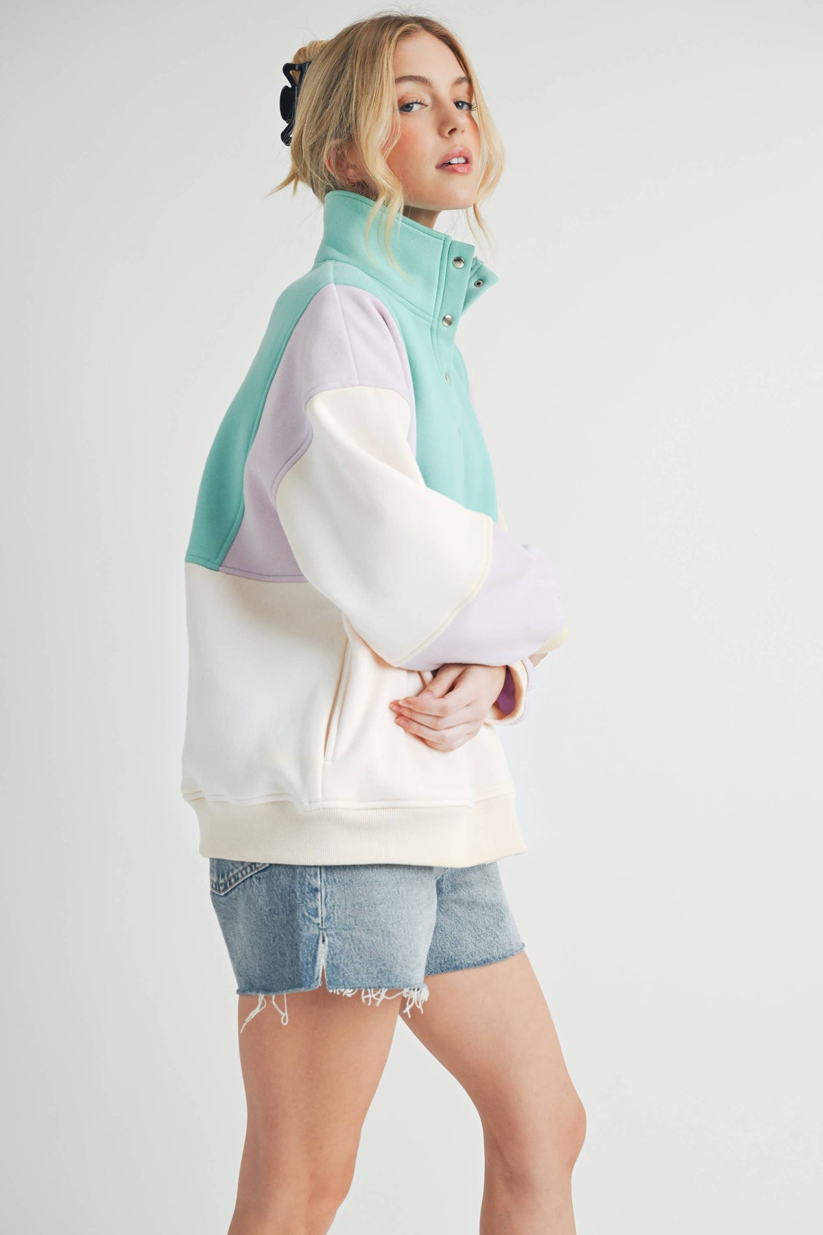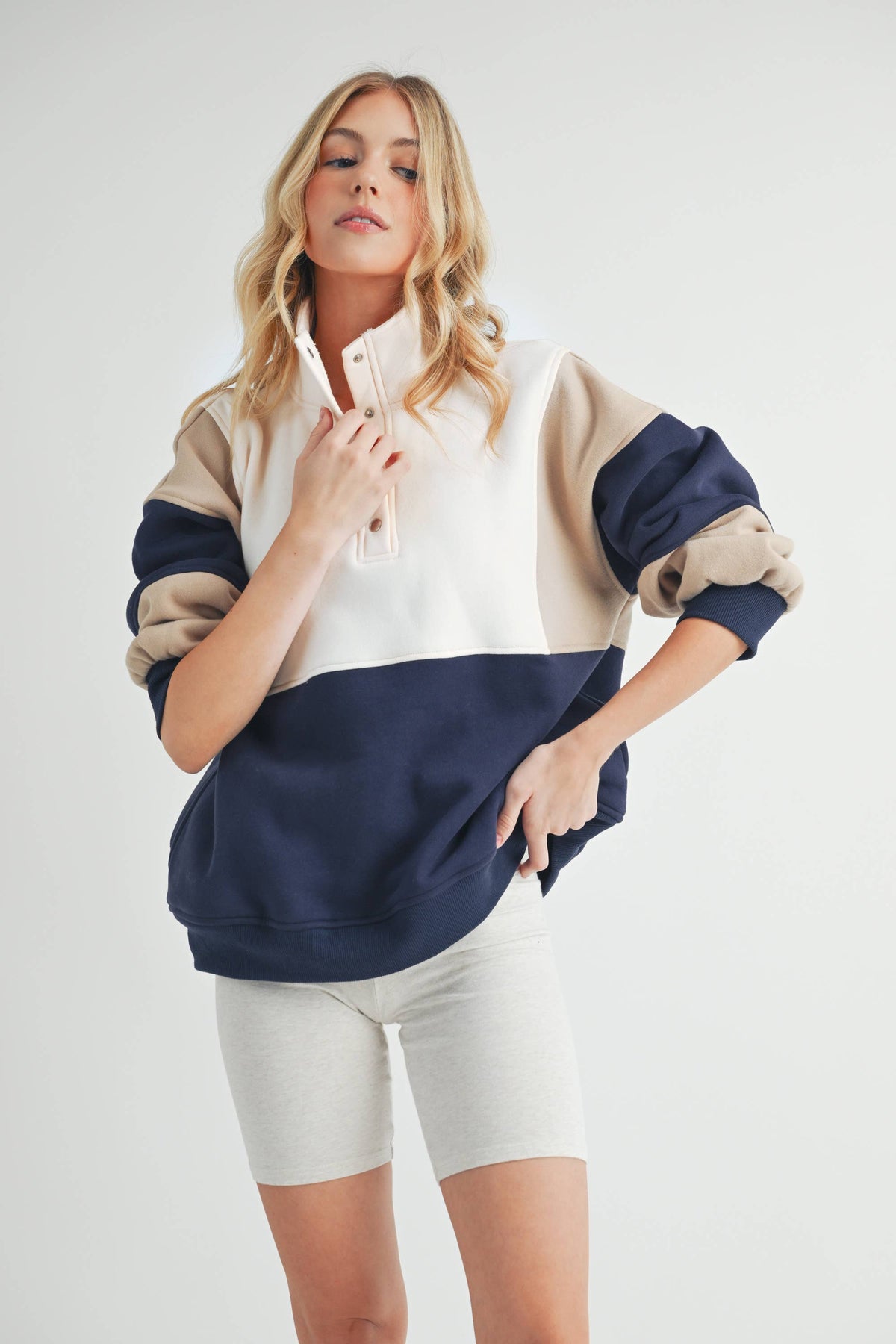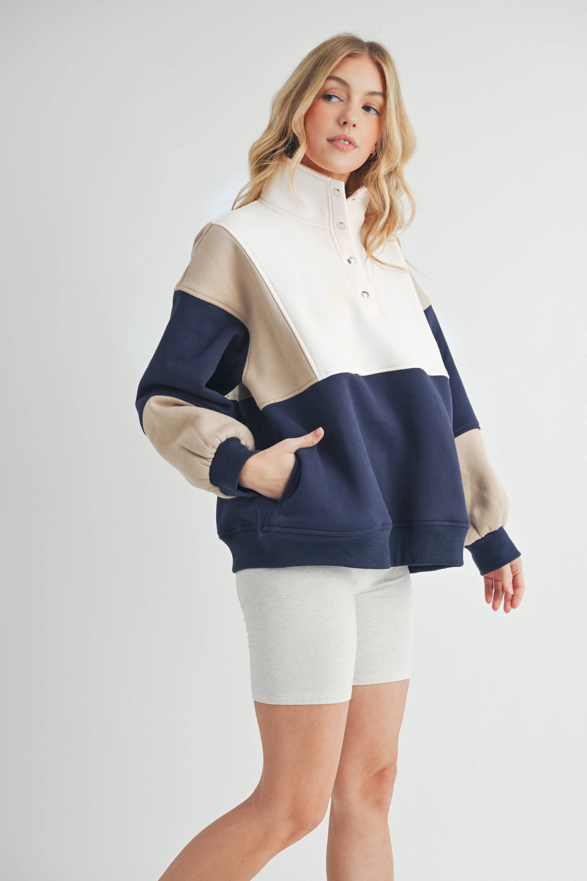 Introducing our chic Glo colorblock pullover, featuring stylish snap buttons for easy wear. This versatile piece combines comfort and modern design, making it a perfect addition to any wardrobe.