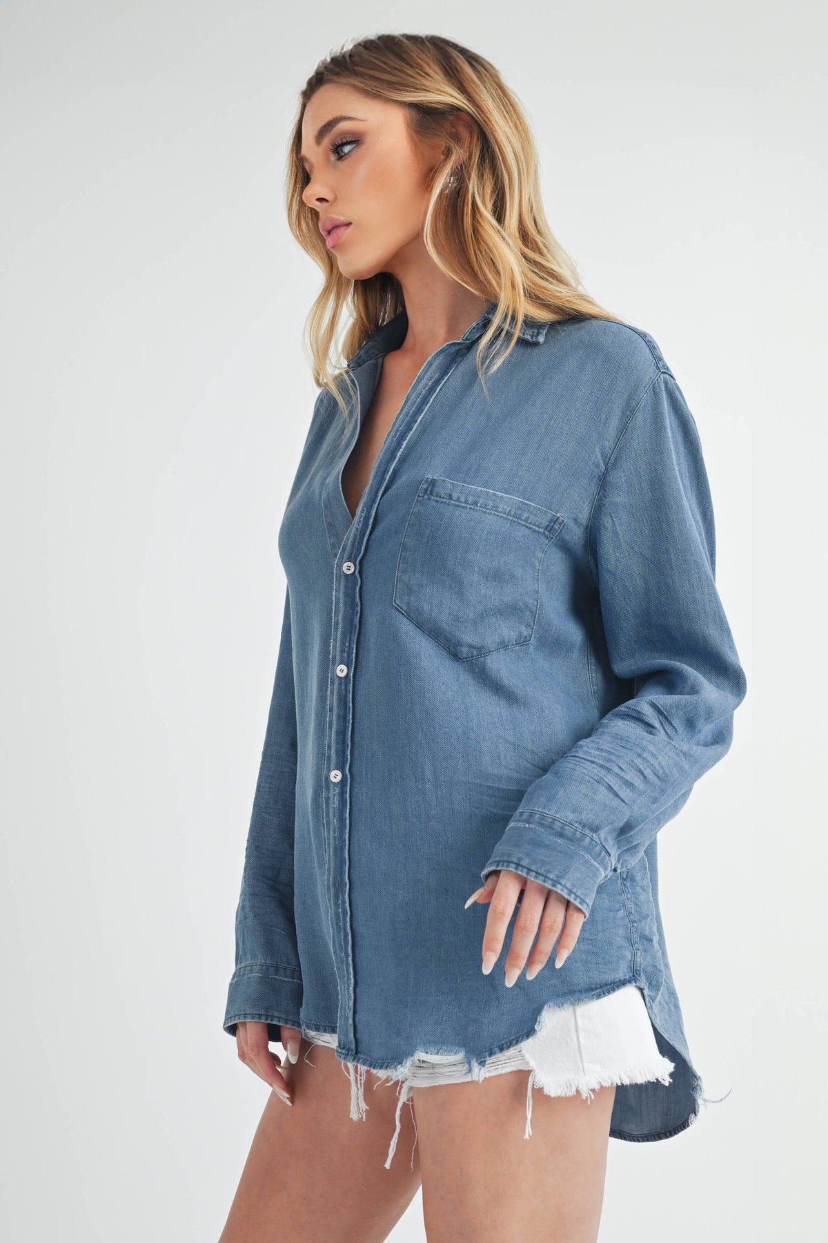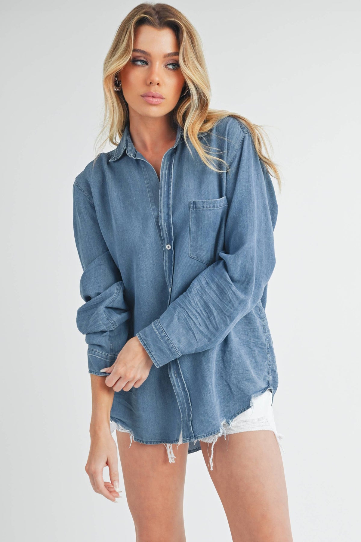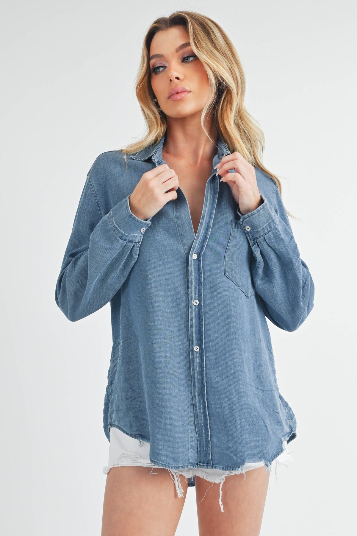Ottavia top is a relaxed fit flatters every figure, embodying the effortless charm of casual style. Her generous cut features our signature bust-flattering button placement. Whether you tuck, tie, or layer this versatile best-seller, the hand-distressed raw shirttail hem is long enough to cover your bum, and the circular shape with soft rounded shoulders ensures a comfortable fit without a back pleat. Complete with a chest pocket for added convenience.