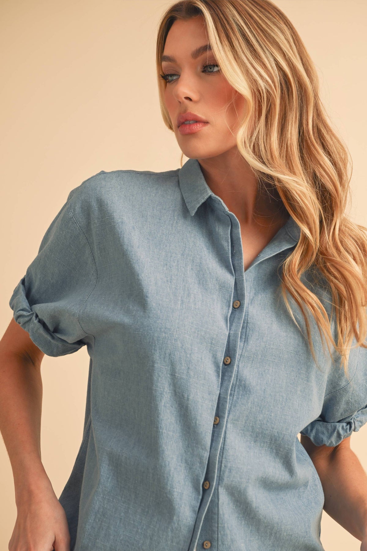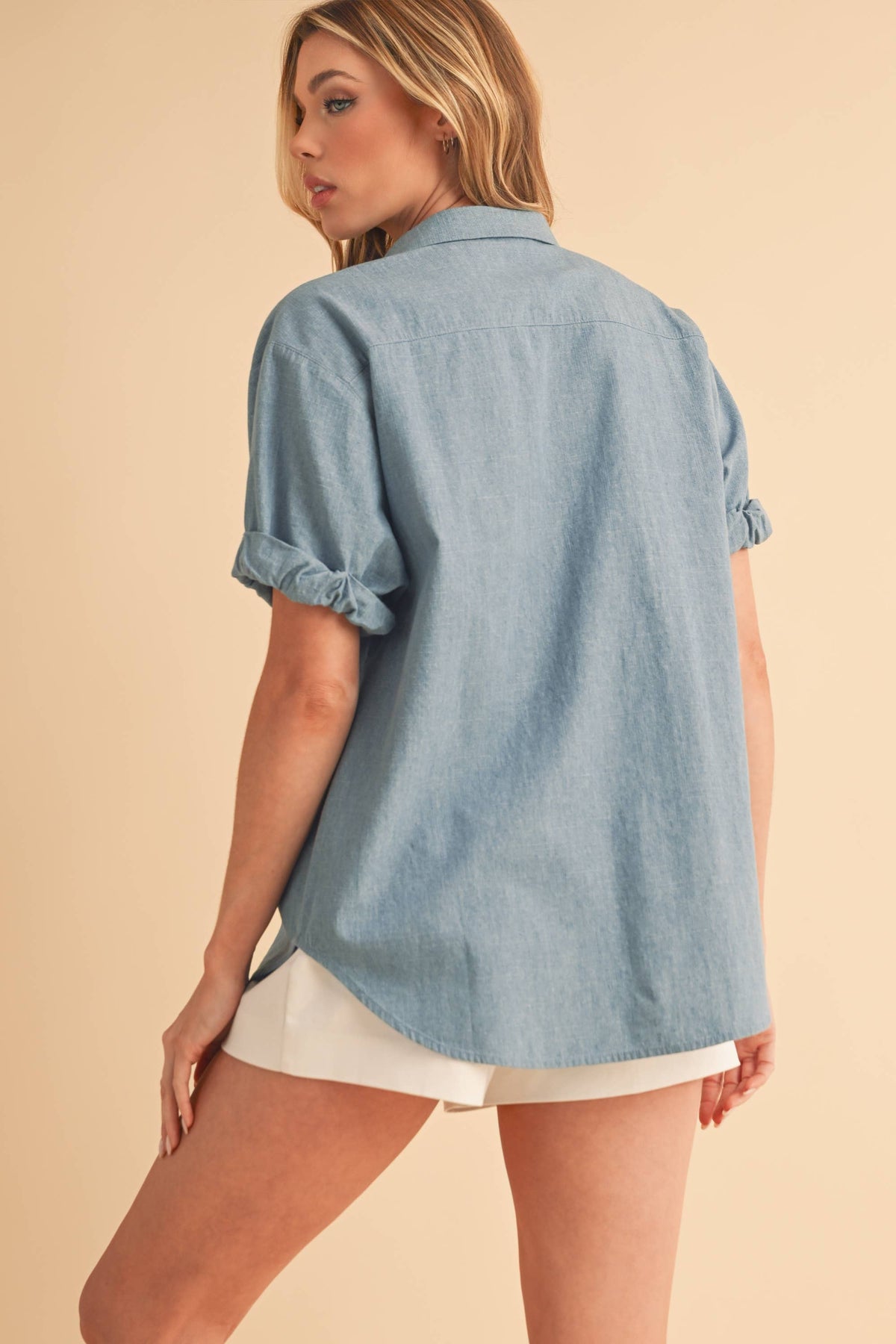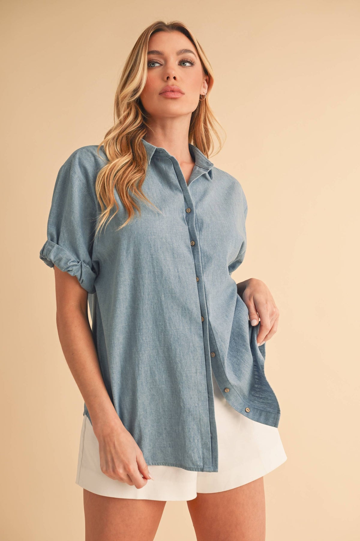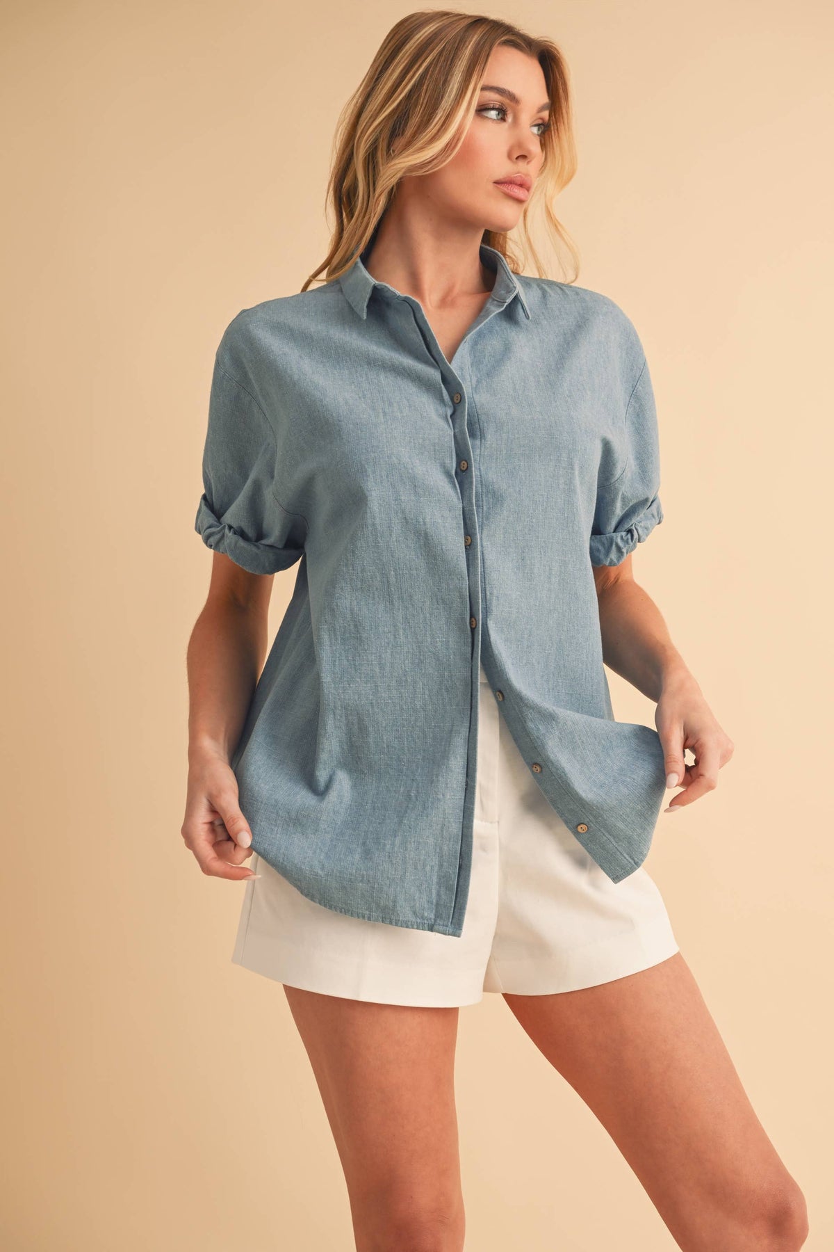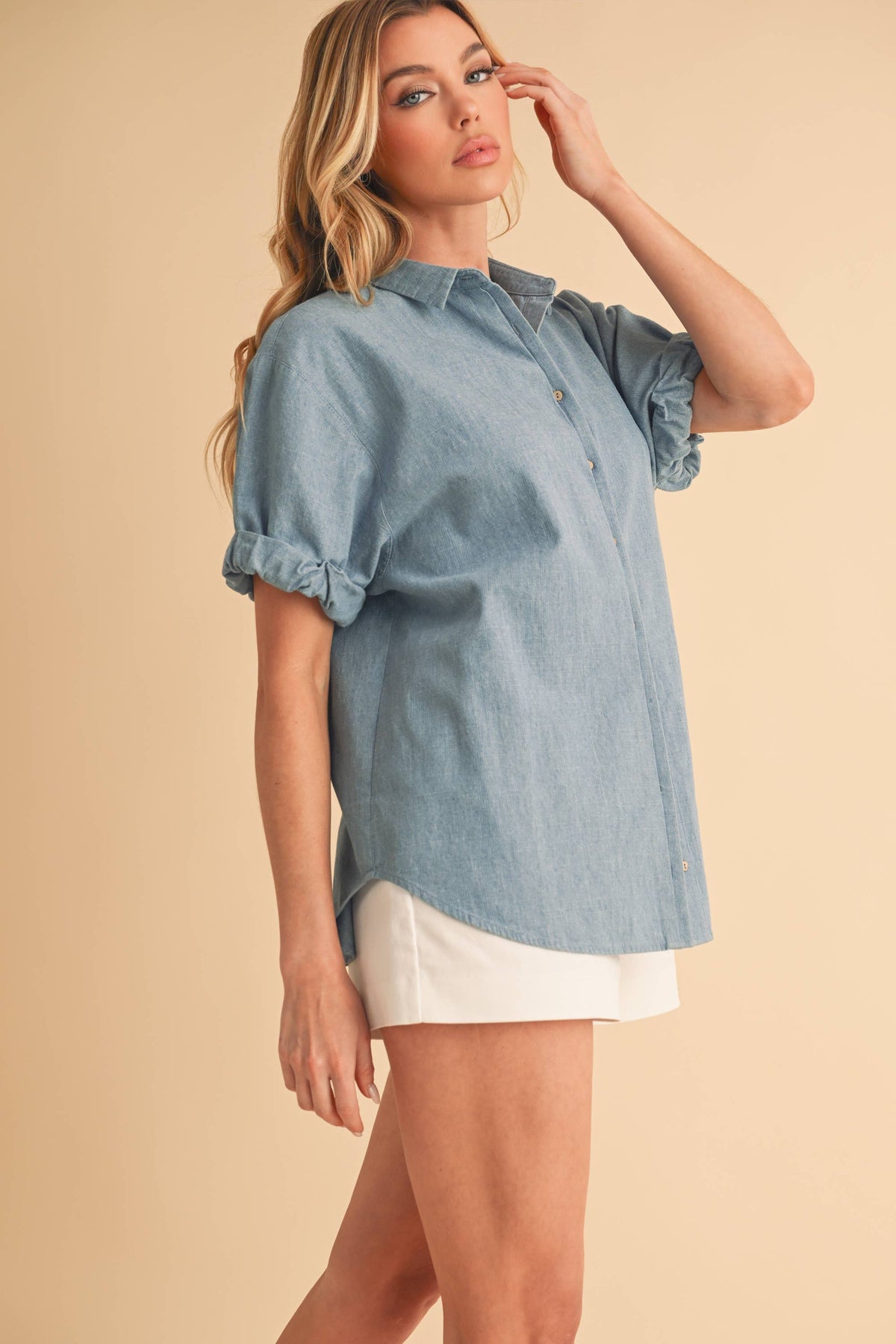 This lightweight denim button-down shirt offers a relaxed silhouette, perfect for effortless, casual styling. Featuring short puff sleeves with elastic cuffs and a classic collar, it pairs beautifully with shorts or leggings for a chic yet laid-back look.