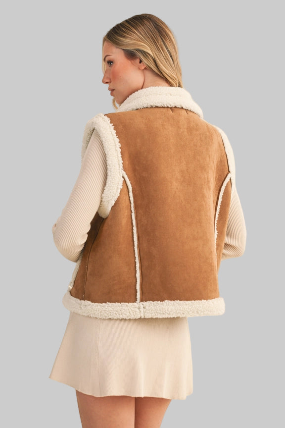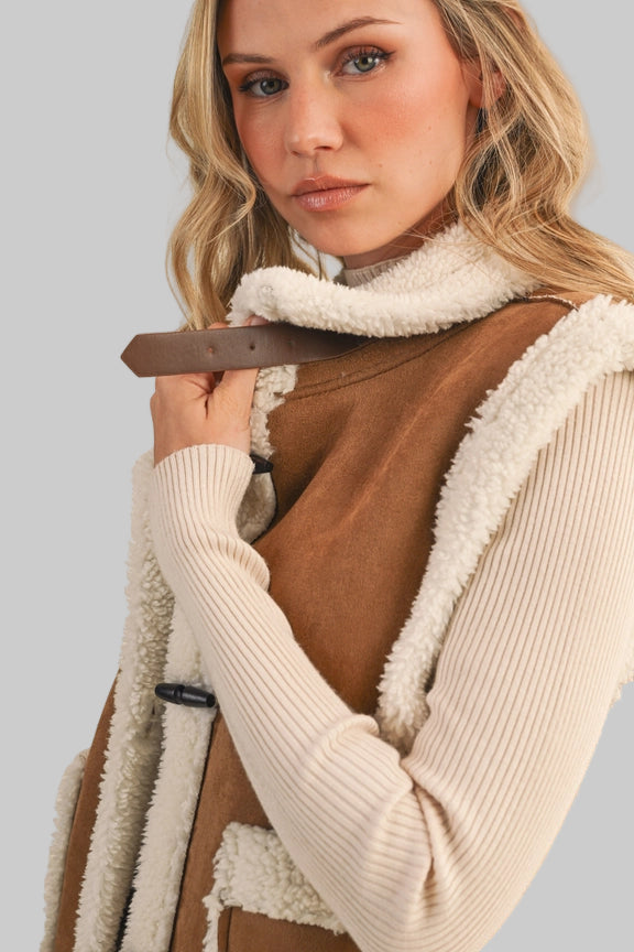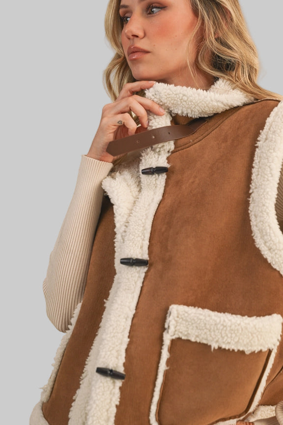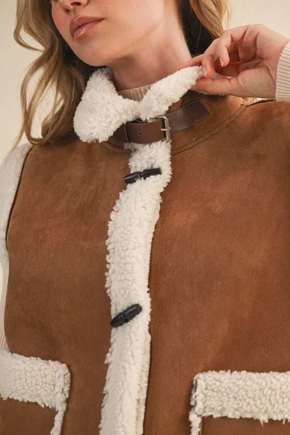 Our Toggle Button Suede and Sherpa Vest is a testament to Klesis' commitment to quality. This stylish outerwear vest is a perfect addition to any woman's wardrobe, offering a unique blend of comfort and style. The toggle button detailing adds a touch of sophistication, while the suede and sherpa materials ensure warmth and durability. With Klesis, you're not just wearing a vest, you're embracing a lifestyle of femininity and sexiness.