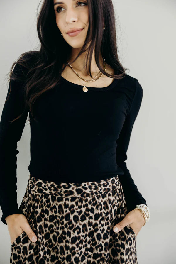 The Black Long Sleeve Scoop Tee offers a flattering scoop neckline combined with full-length sleeves for versatile layering or standalone wear. Crafted from soft, breathable fabric, it ensures comfort throughout the day while maintaining a sleek, minimalist style ideal for both casual and polished outfits. A reliable wardrobe essential that balances simplicity with function.