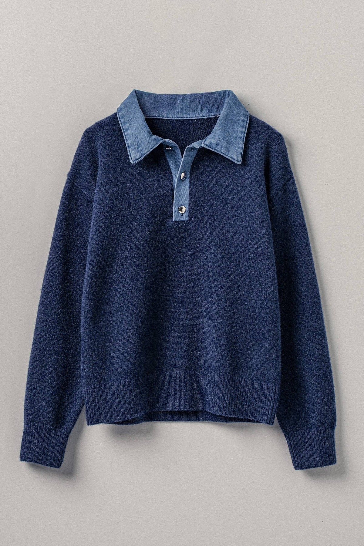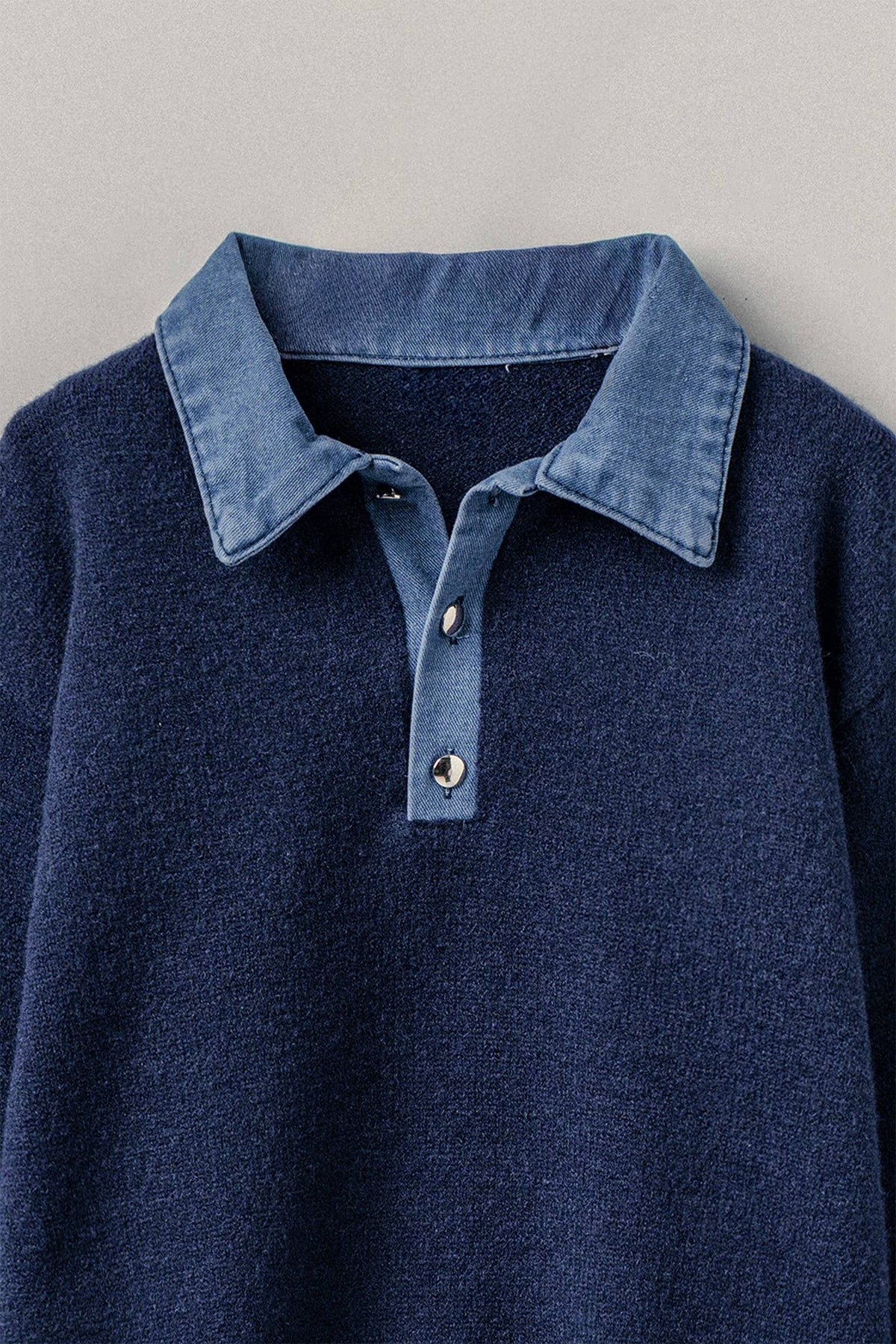 This cozy knit pullover features a contrast denim collar and placket for a Western-inspired touch. Its soft texture and relaxed fit make it perfect for layering over denim or pairing with casual sets for everyday ease.