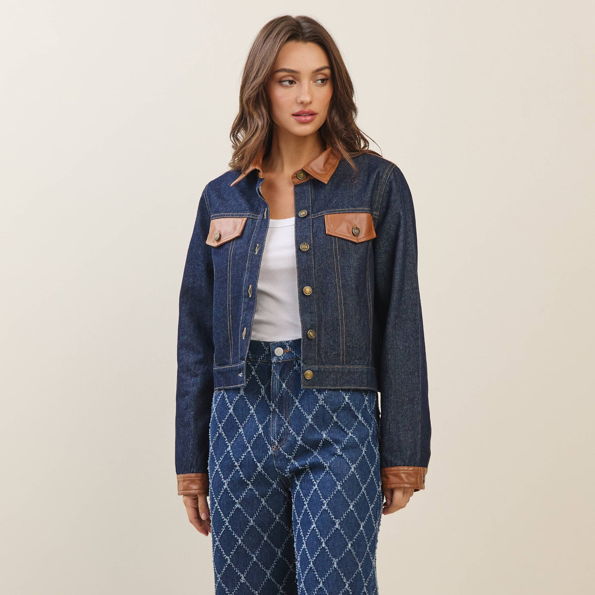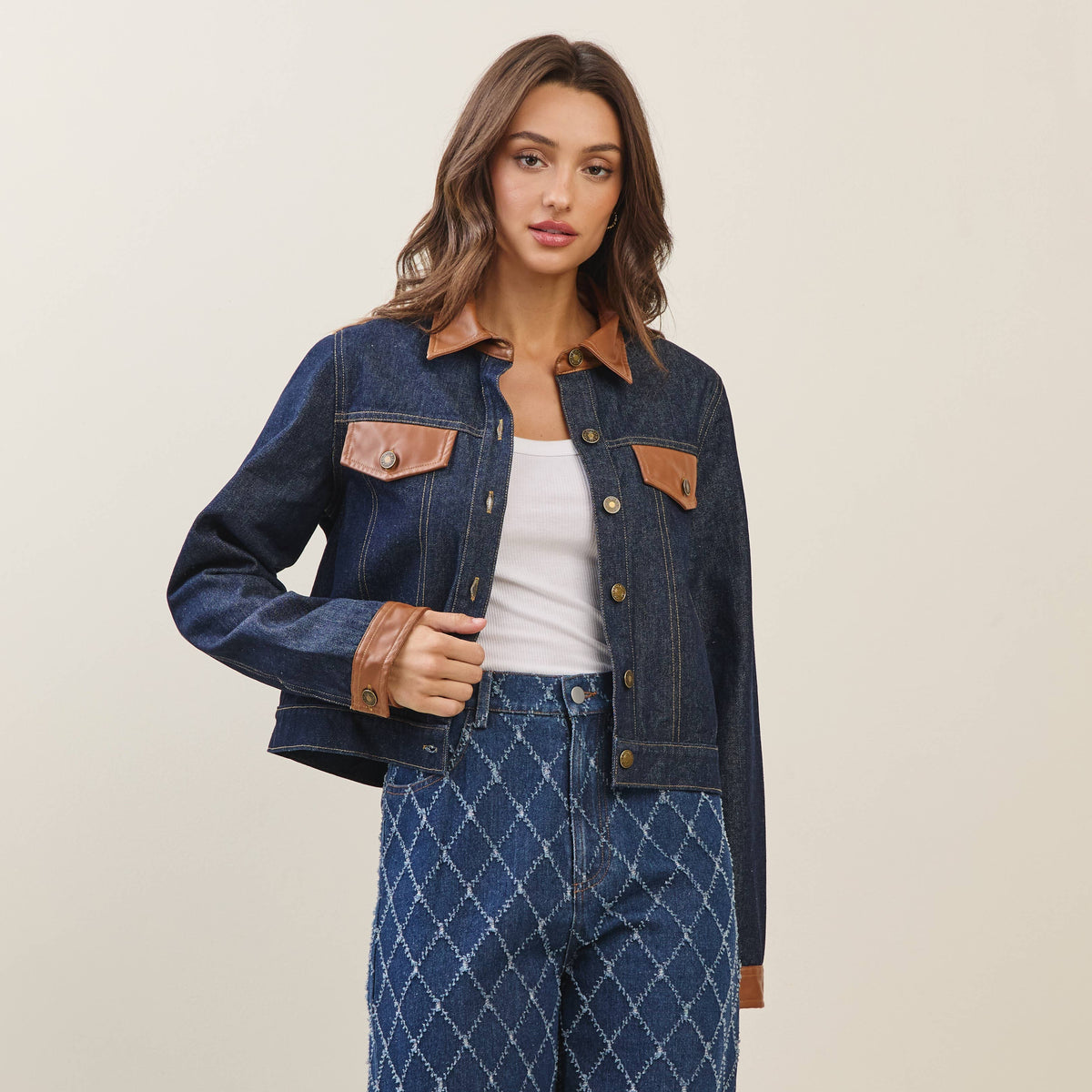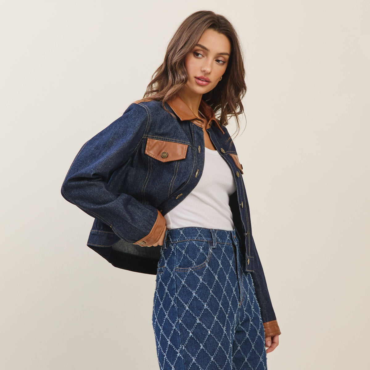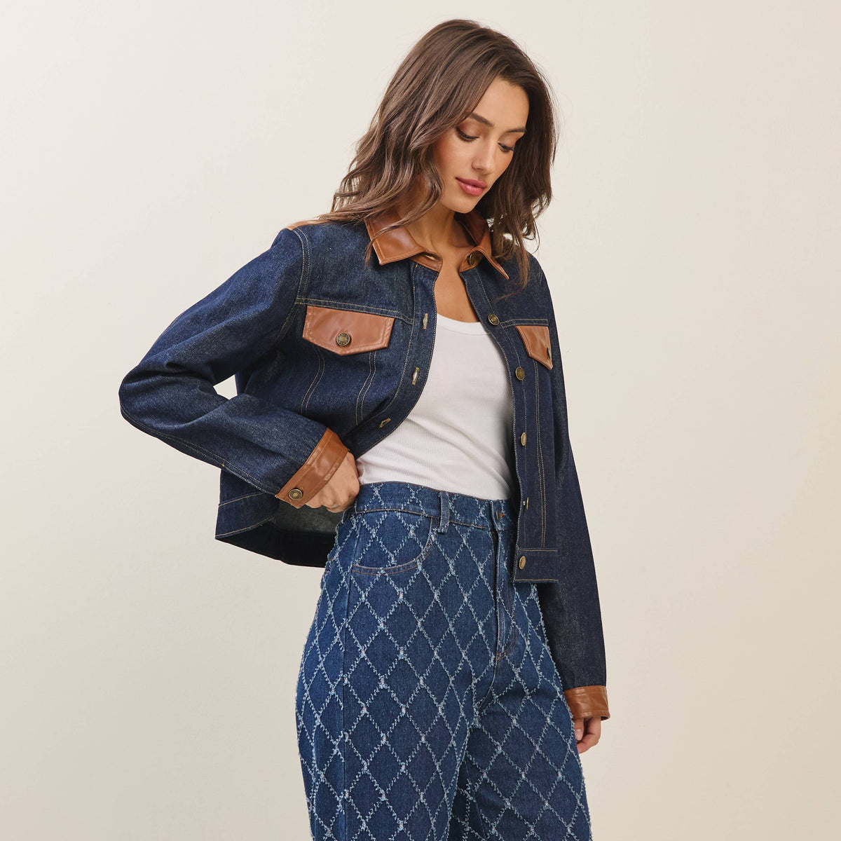 This jacket brings together the best of both worlds with dark denim and faux leather trims for a bold, mixed-media look. The vegan leather collar adds an edgy twist while keeping it cruelty-free. Perfect for those who like a playful, standout style without compromising on comfort or ethics. Dress it up or down for endless outfit possibilities!