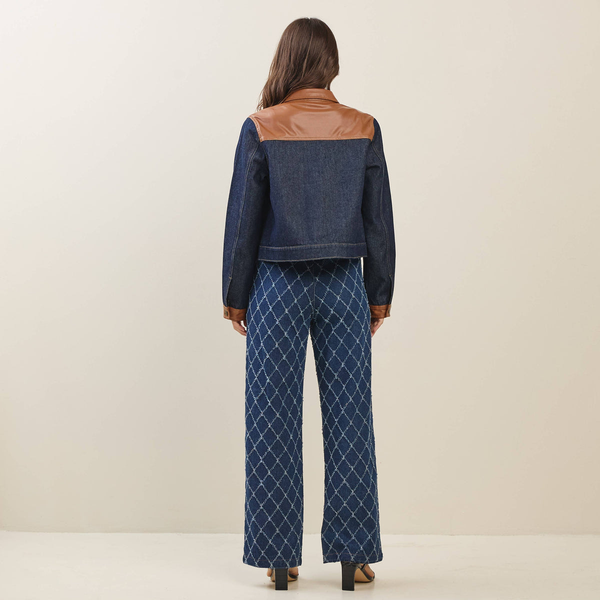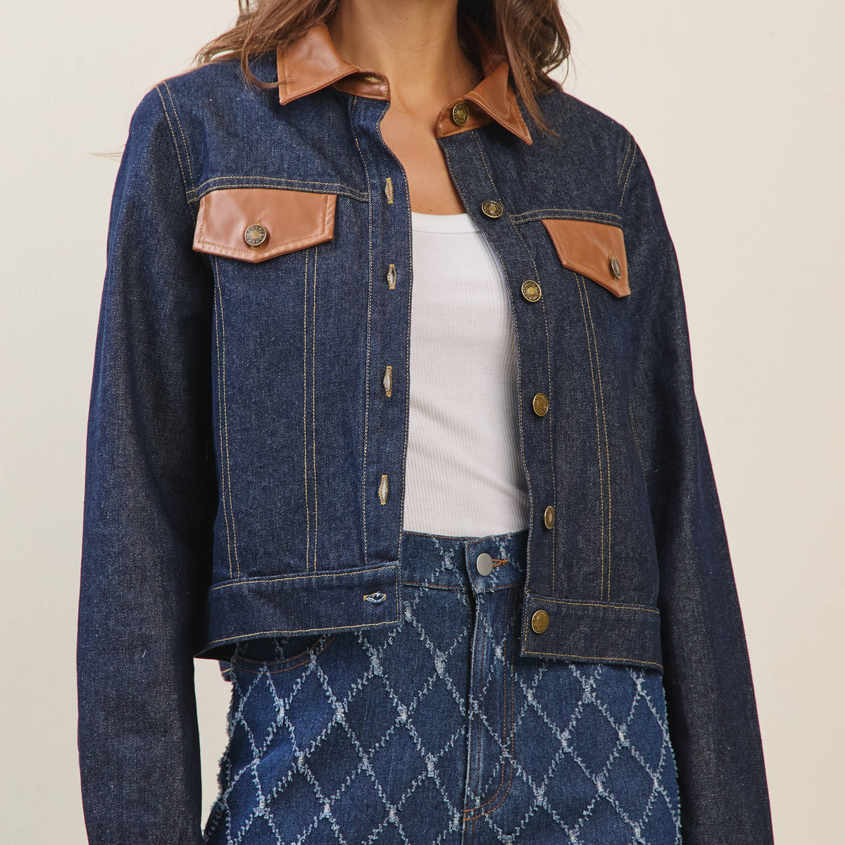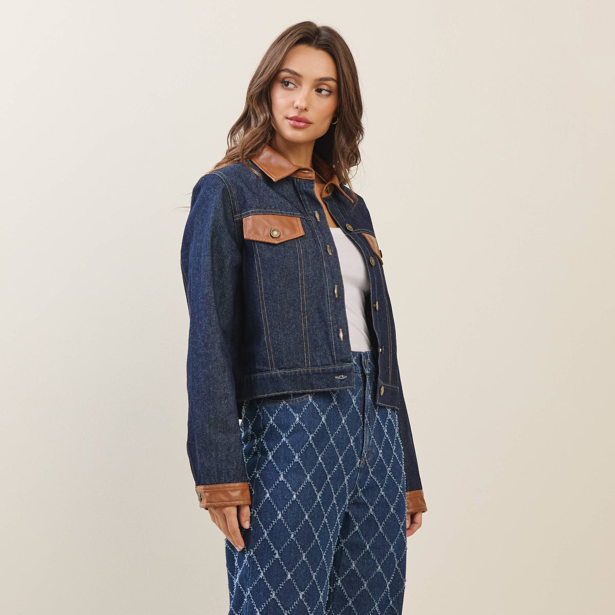 This jacket brings together the best of both worlds with dark denim and faux leather trims for a bold, mixed-media look. The vegan leather collar adds an edgy twist while keeping it cruelty-free. Perfect for those who like a playful, standout style without compromising on comfort or ethics. Dress it up or down for endless outfit possibilities!