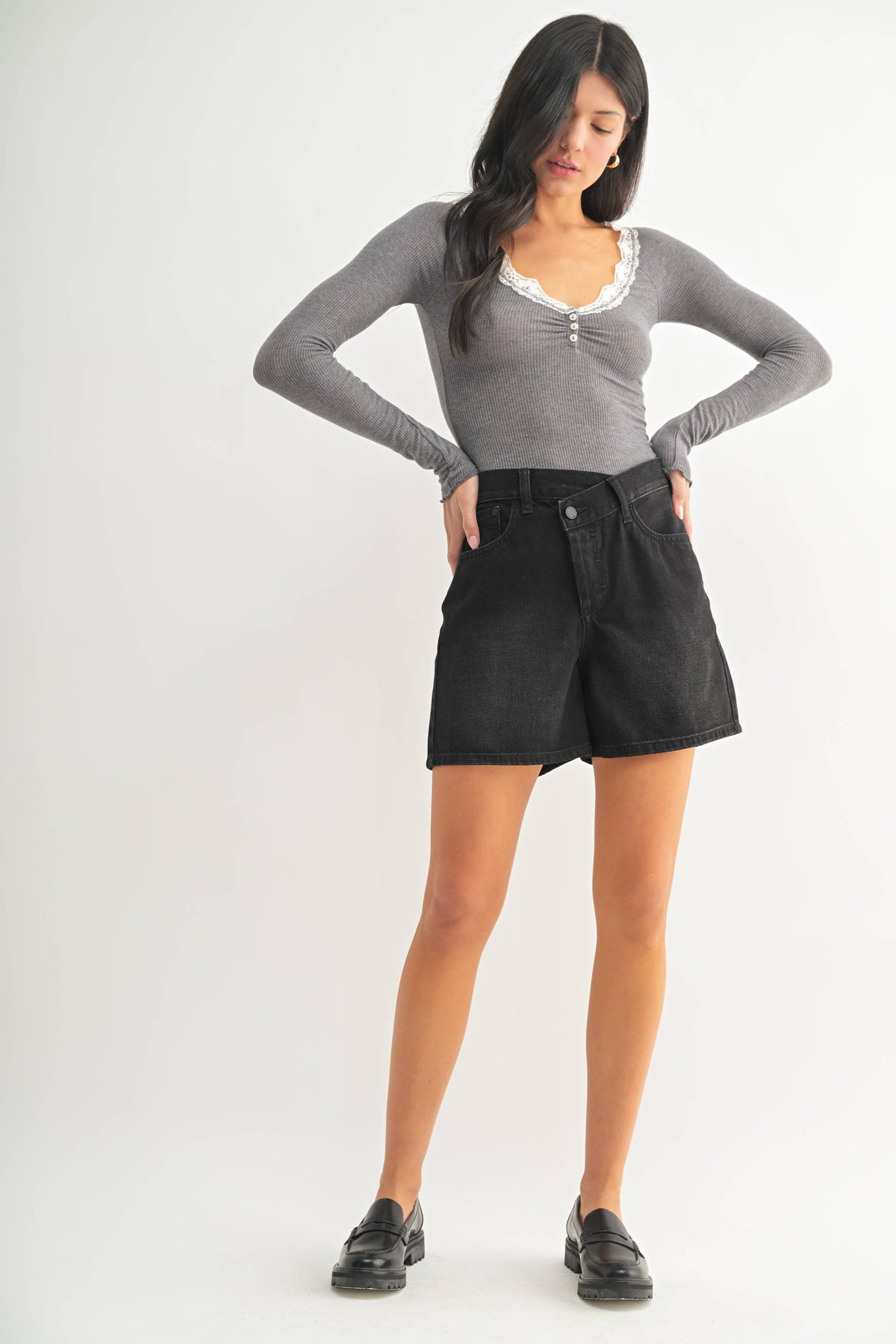 Add some interest to your look with a criss-cross button fly short. This washed black pair has some give through the legs, and super-high, super-snatched waistline.