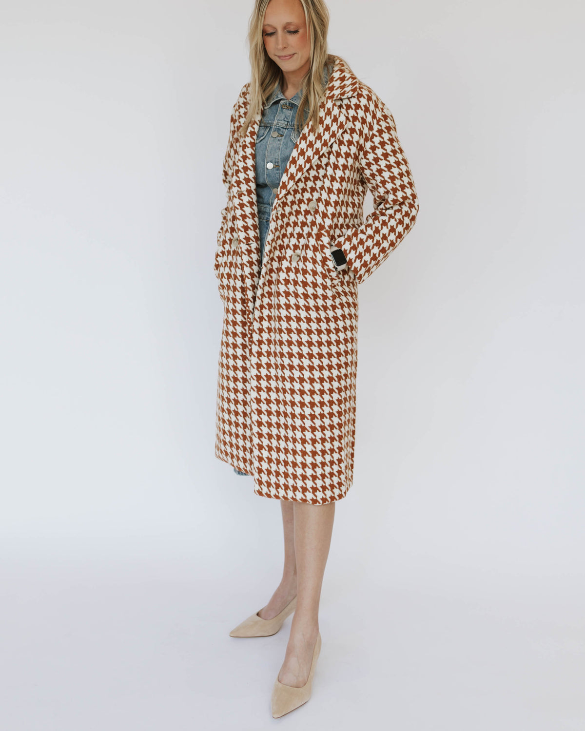 This stunning coat brings together timeless style and everyday wearability. The iconic houndstooth pattern never goes out of fashion, while the V-neck collar and long sleeves deliver that polished, put-together vibe. Slip your hands into the functional pockets—because who doesn't love a coat that actually works for you? The full lining keeps things smooth and comfortable all day long, making this your go-to piece for looking effortlessly chic.