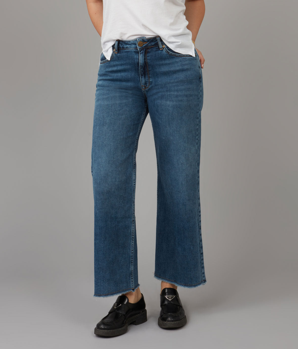 Milan is a 70s inspired wide leg jean, cut at an ultra high rise and finished off with a raw edge hem. This version in Dim Sky is the perfect medium blue that dresses up with heels or down with sneakers.