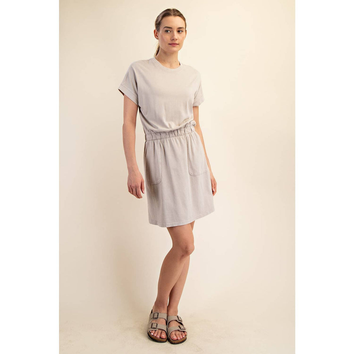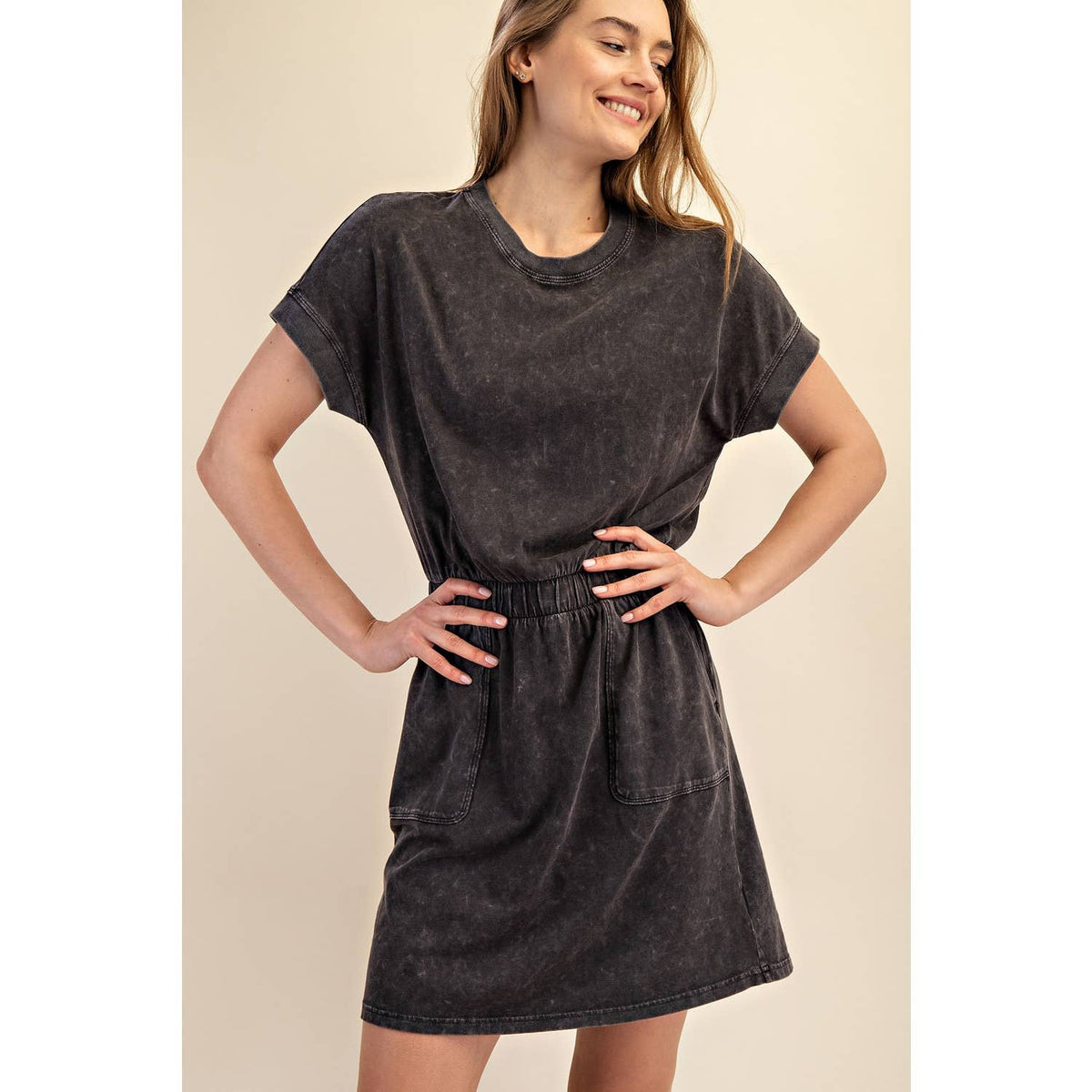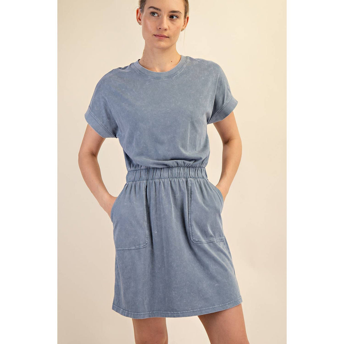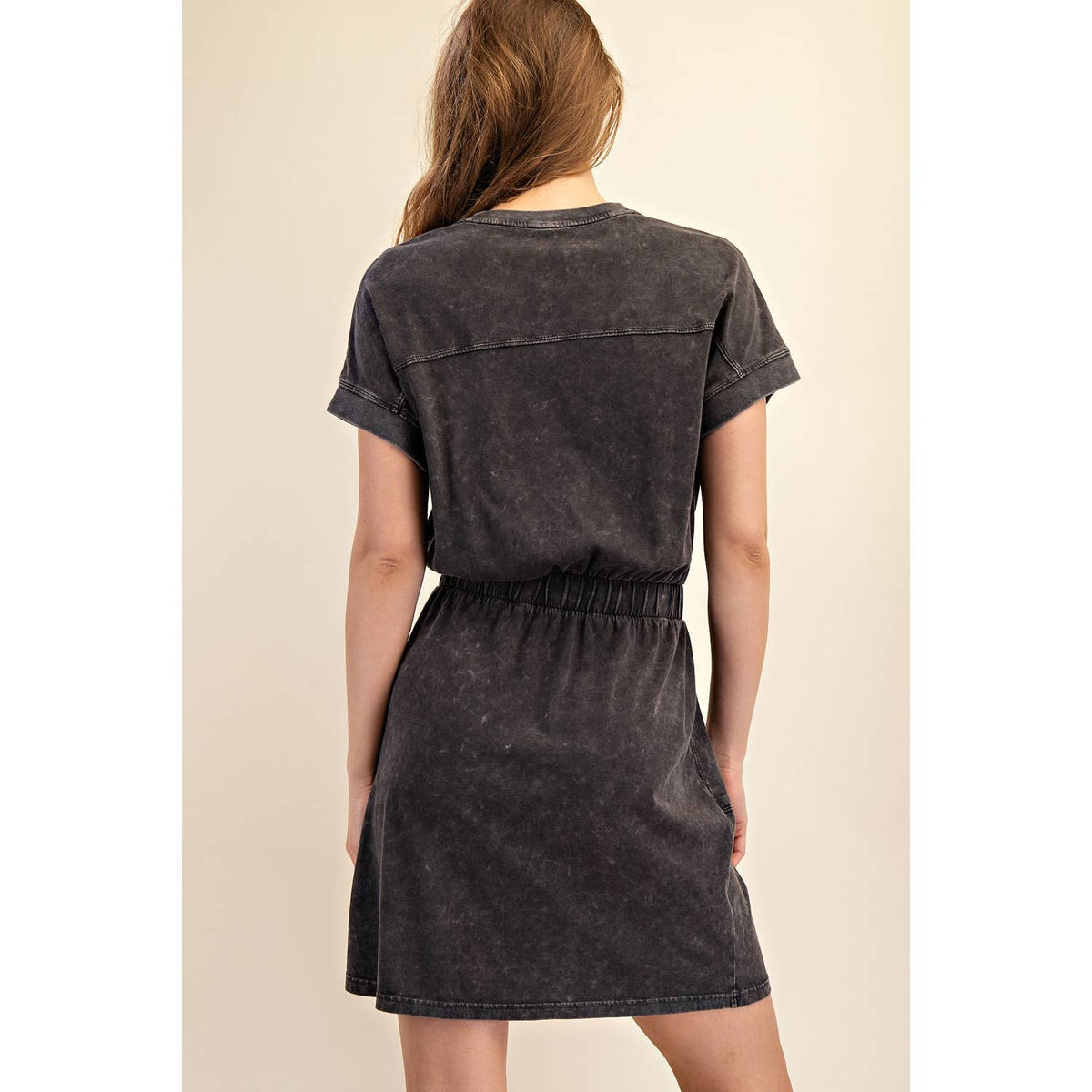 - Style No.: D1190 Effortlessly chic and ultra-comfy, this mineral-washed cotton short sleeve mini dress features a relaxed silhouette with an elastic waistband for a flattering fit. Perfect for casual days and easy styling. Features: - Mineral washed cotton fabric - Relaxed fit - Crew neck - Short sleeve - Dropped shoulder - Elastic waistband - Side pockets Model is 5'8" and wearing size Small. Fabric: 100% Cotton C.O.O: Import