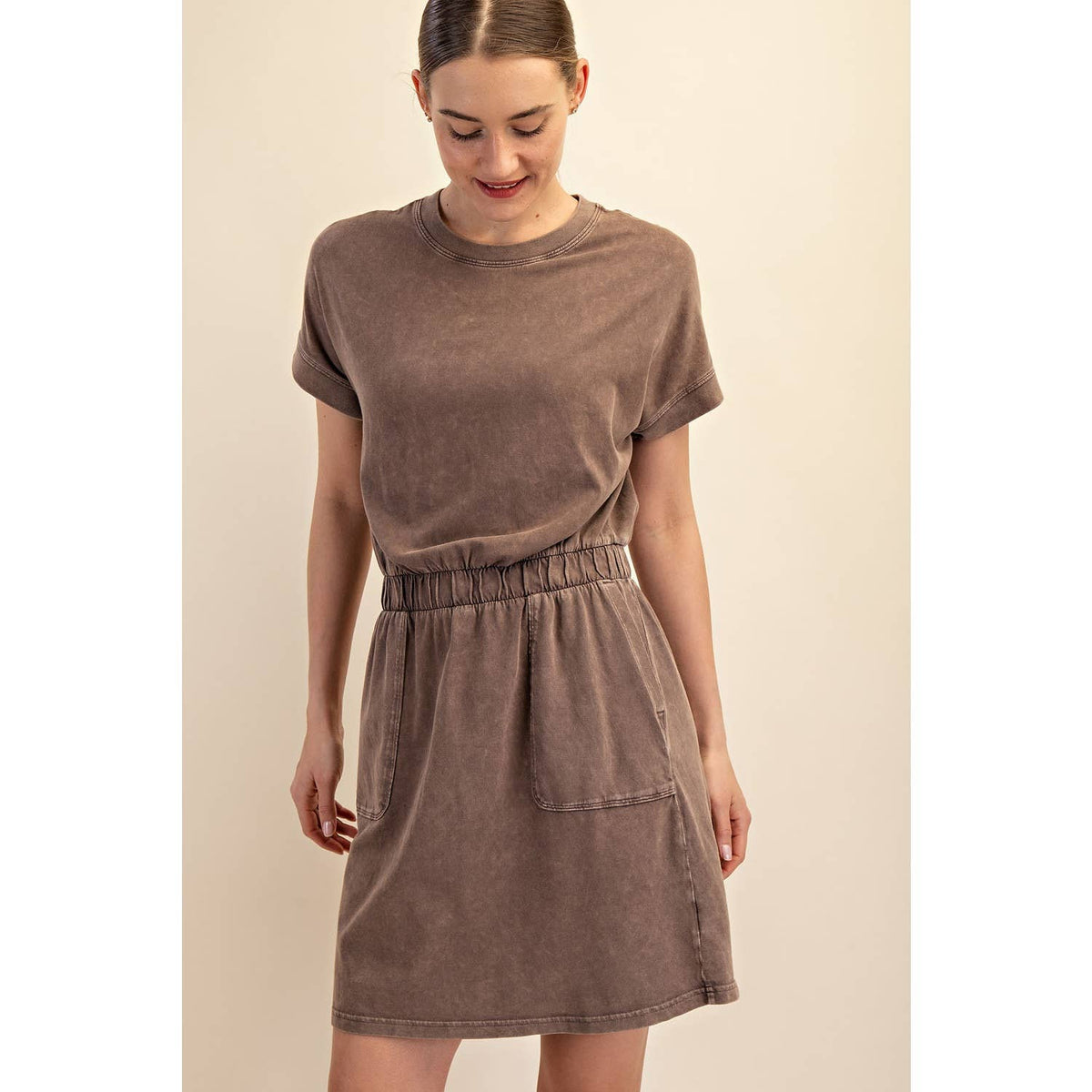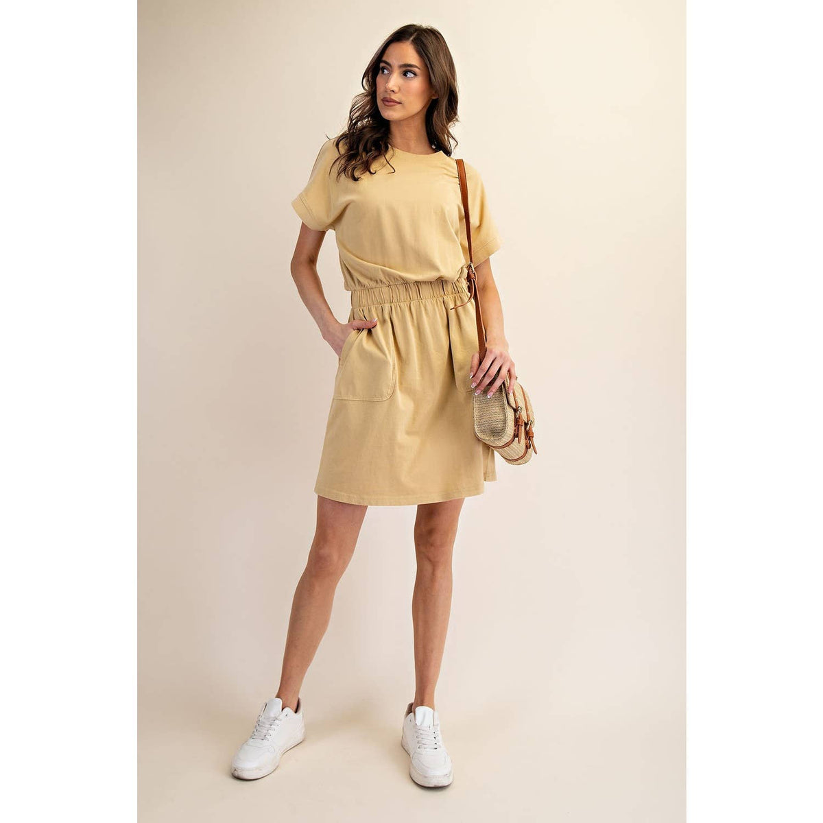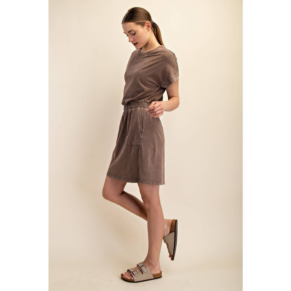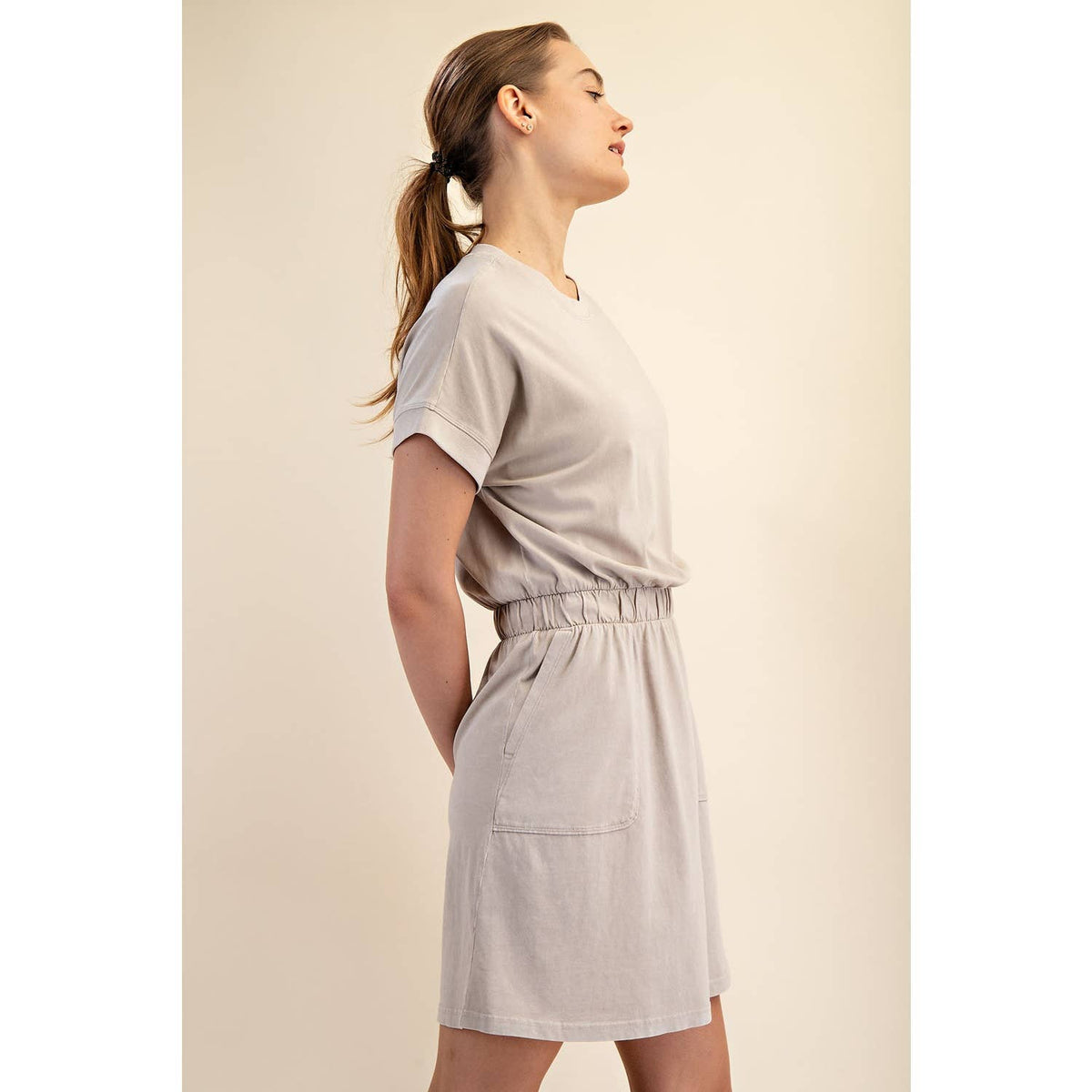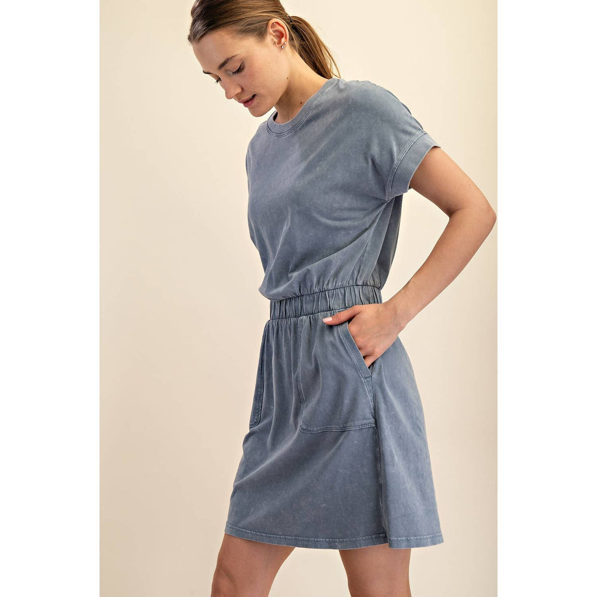 - Style No.: D1190 Effortlessly chic and ultra-comfy, this mineral-washed cotton short sleeve mini dress features a relaxed silhouette with an elastic waistband for a flattering fit. Perfect for casual days and easy styling. Features: - Mineral washed cotton fabric - Relaxed fit - Crew neck - Short sleeve - Dropped shoulder - Elastic waistband - Side pockets Model is 5'8" and wearing size Small. Fabric: 100% Cotton C.O.O: Import