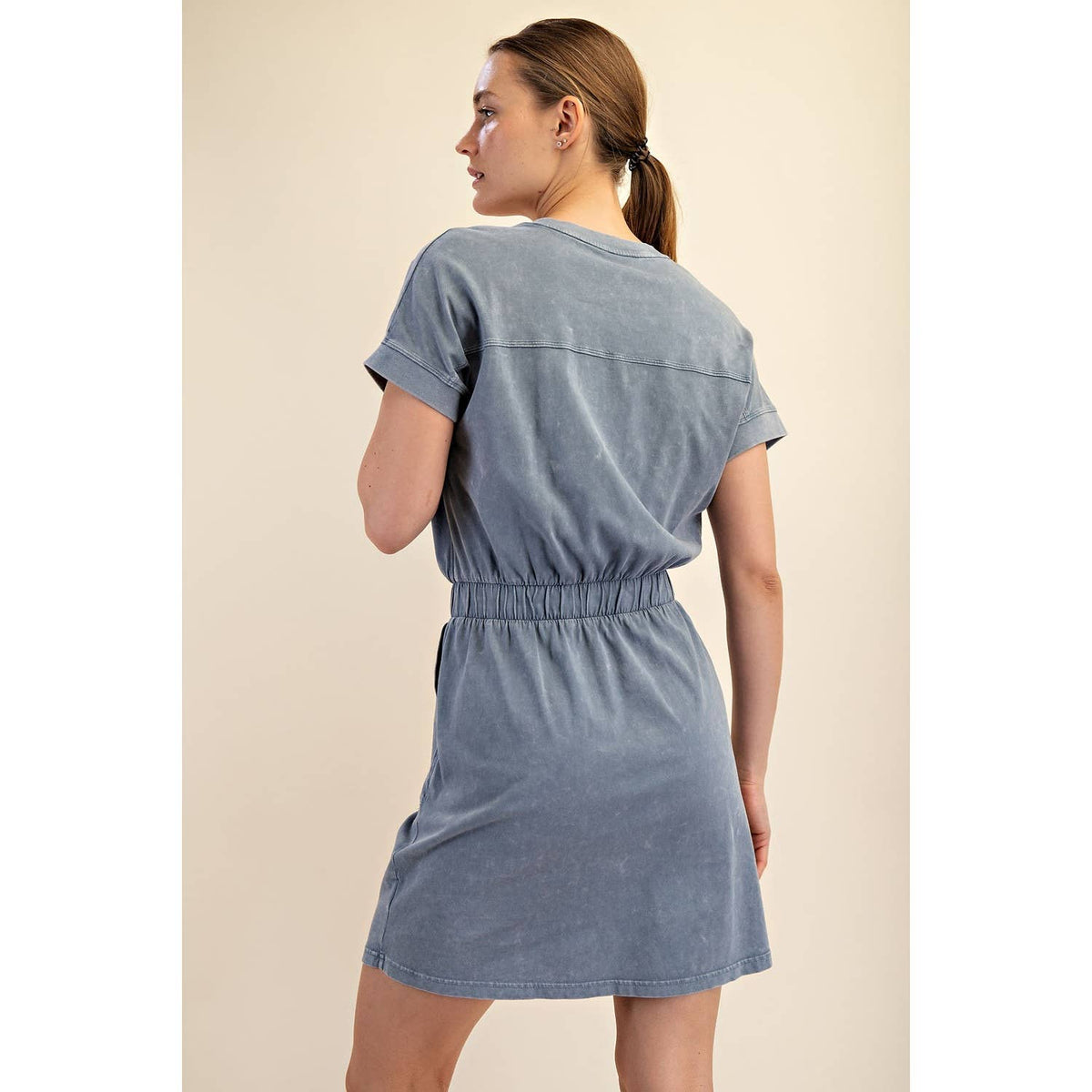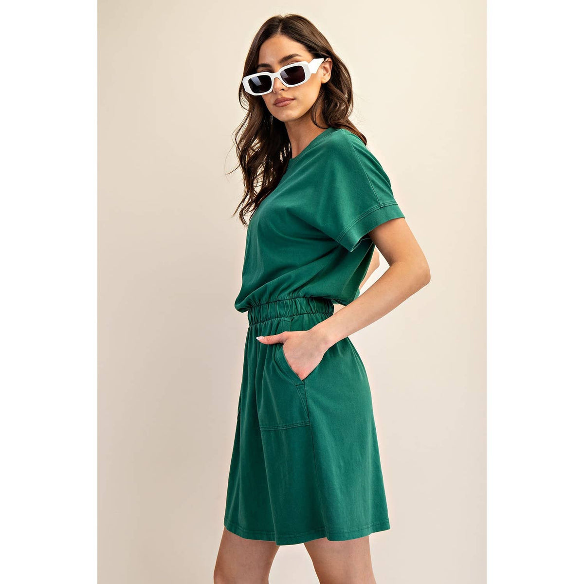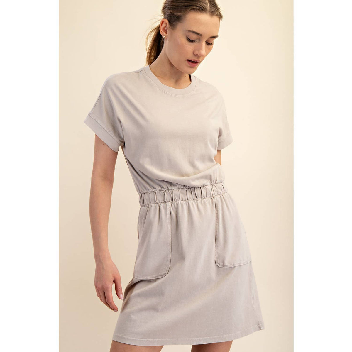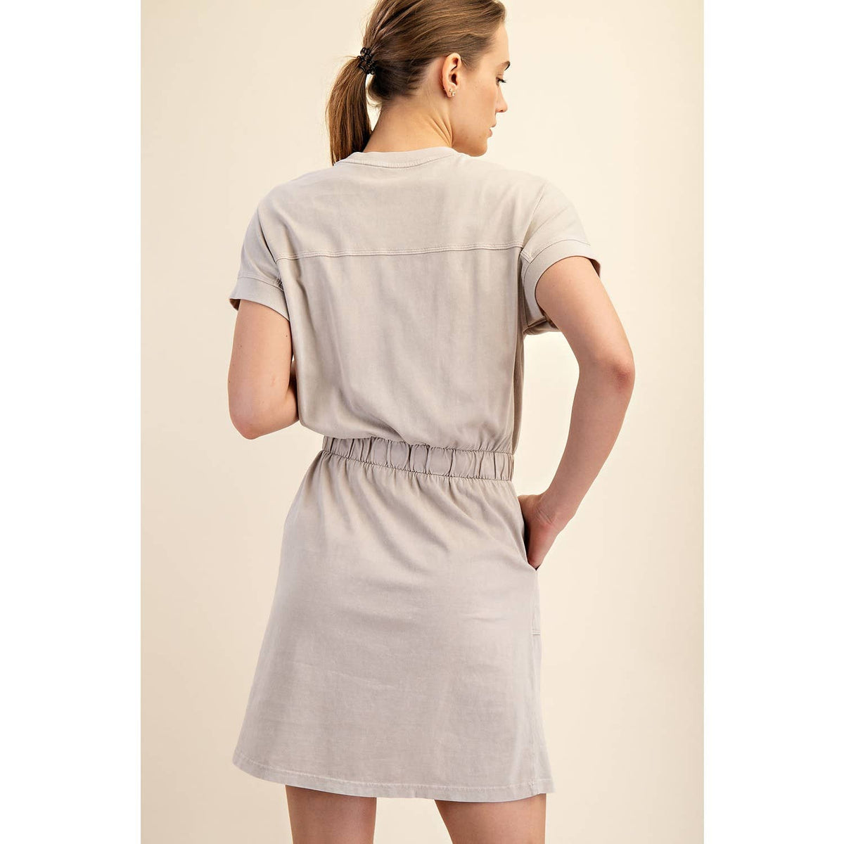 - Style No.: D1190 Effortlessly chic and ultra-comfy, this mineral-washed cotton short sleeve mini dress features a relaxed silhouette with an elastic waistband for a flattering fit. Perfect for casual days and easy styling. Features: - Mineral washed cotton fabric - Relaxed fit - Crew neck - Short sleeve - Dropped shoulder - Elastic waistband - Side pockets Model is 5'8" and wearing size Small. Fabric: 100% Cotton C.O.O: Import