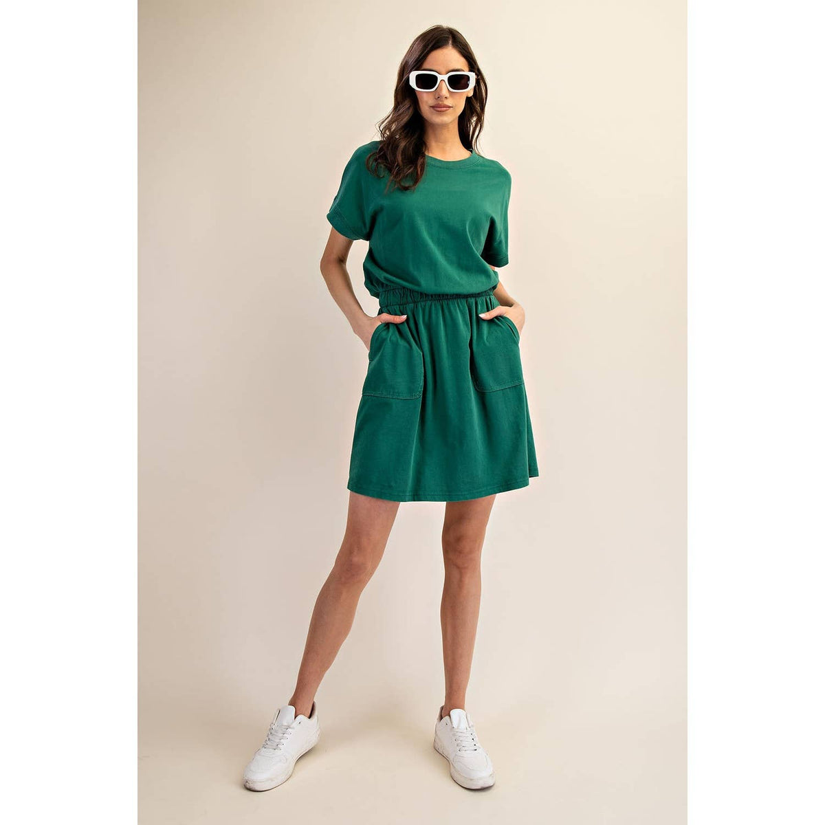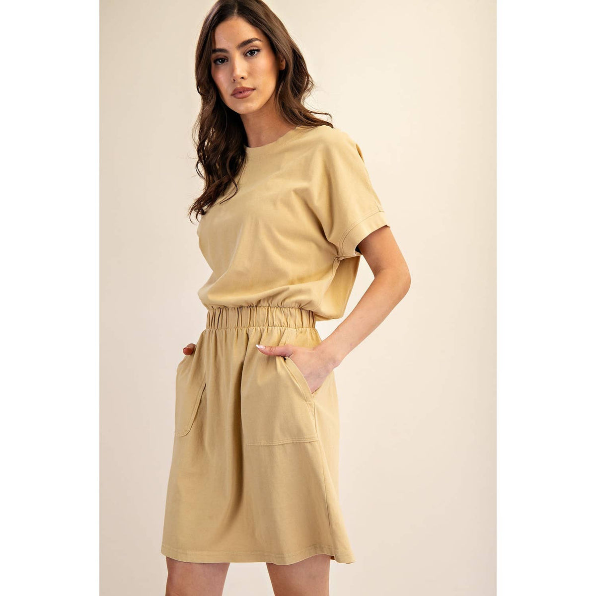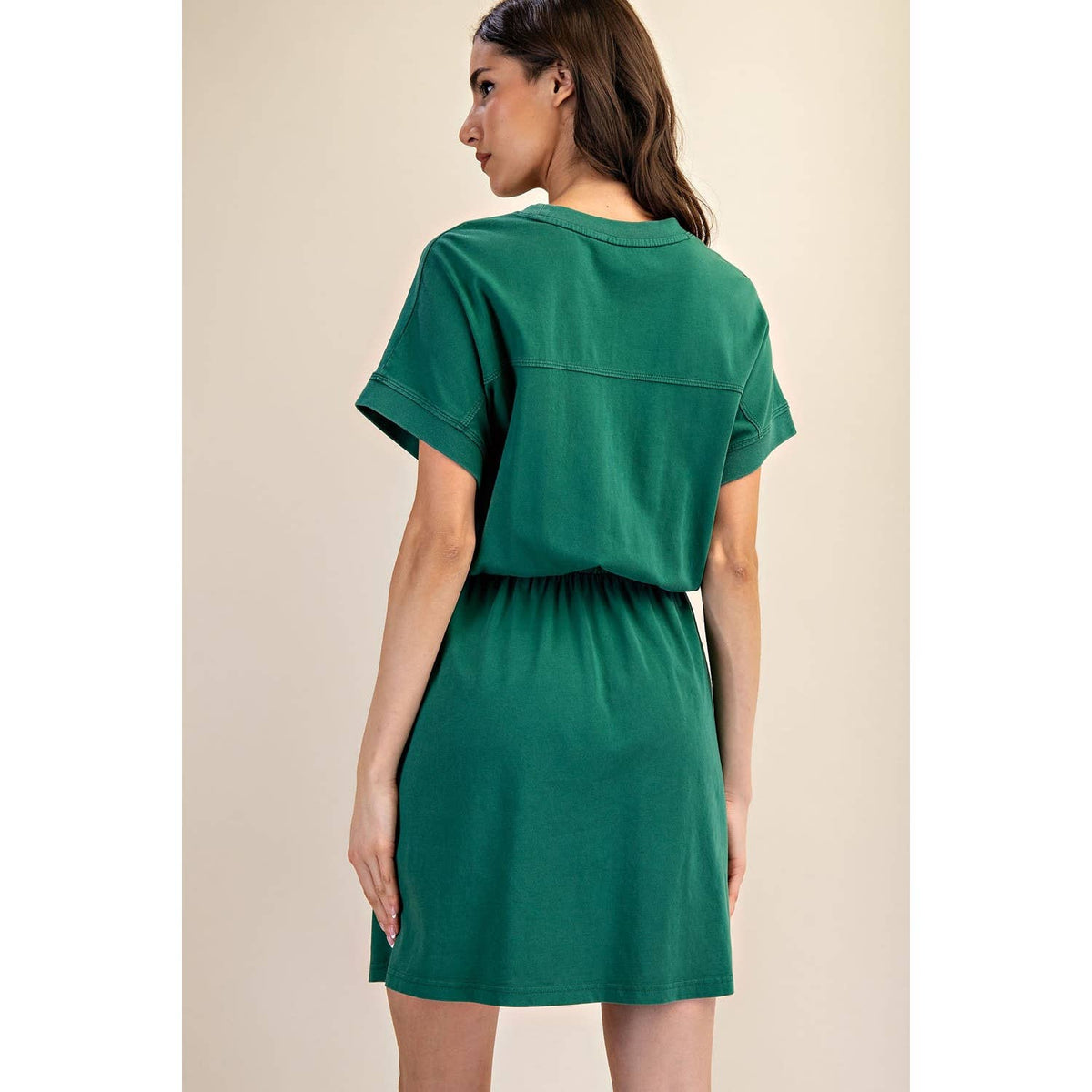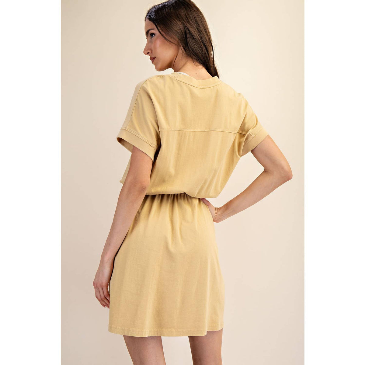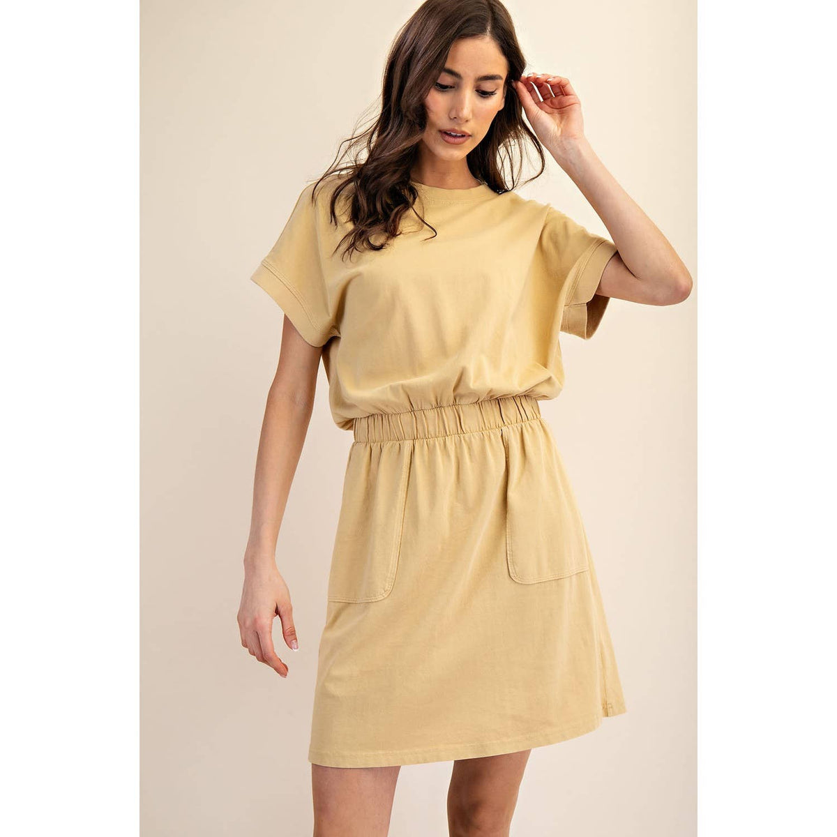 - Style No.: D1190 Effortlessly chic and ultra-comfy, this mineral-washed cotton short sleeve mini dress features a relaxed silhouette with an elastic waistband for a flattering fit. Perfect for casual days and easy styling. Features: - Mineral washed cotton fabric - Relaxed fit - Crew neck - Short sleeve - Dropped shoulder - Elastic waistband - Side pockets Model is 5'8" and wearing size Small. Fabric: 100% Cotton C.O.O: Import