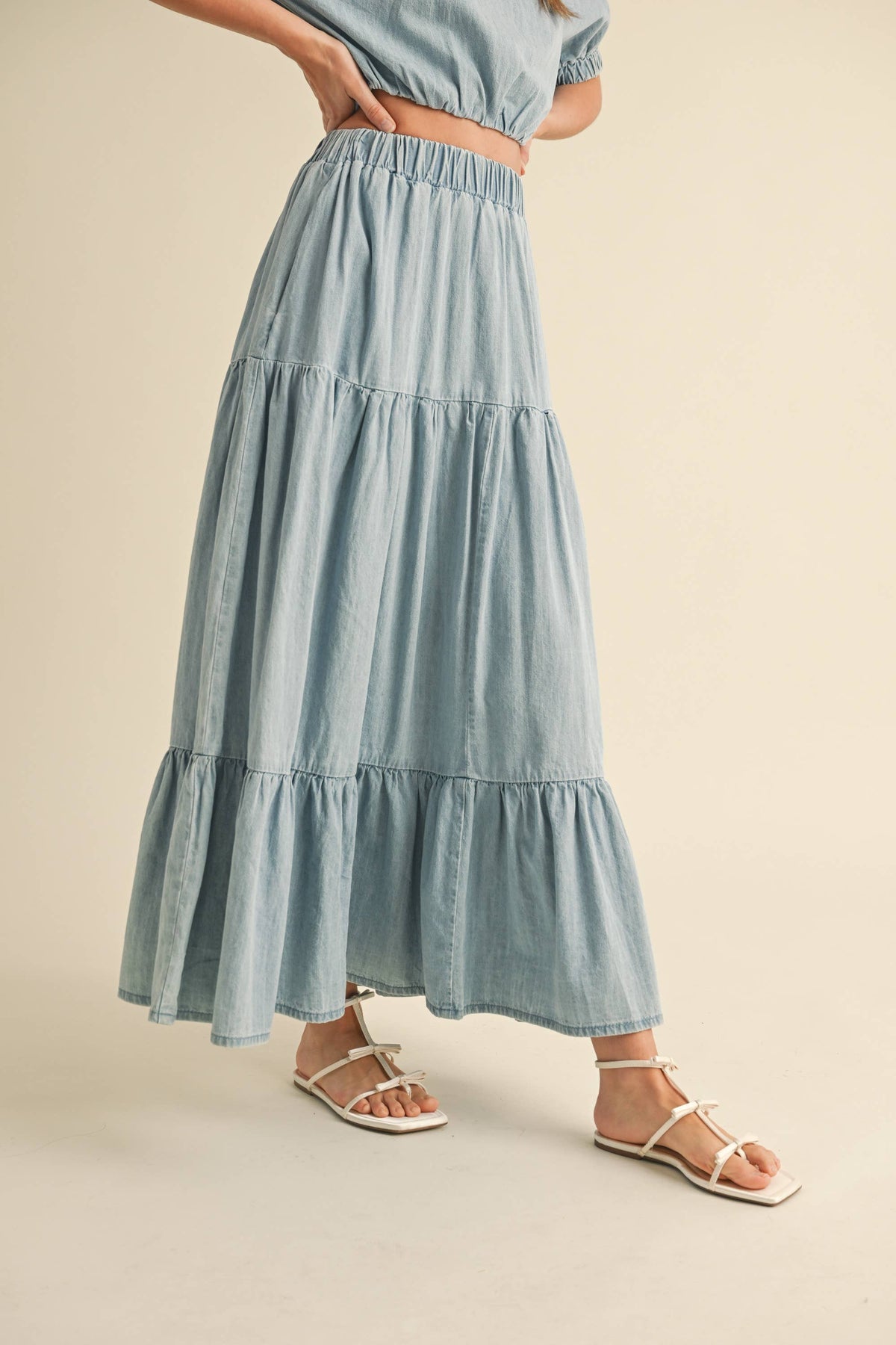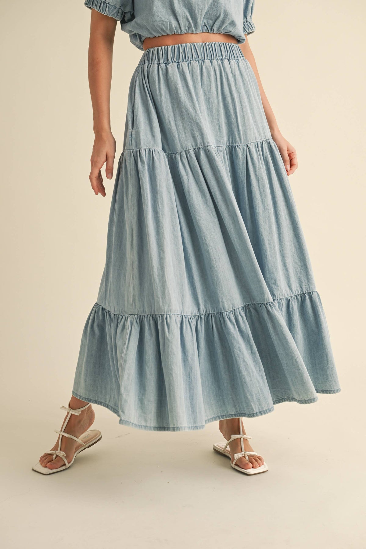 TIERED DENIM SKIRT MATCHING TOP : T3843ST * * Size & Fit * * * * * * * * * * * * * * * * Model is wearing size S Measurements taken from size S Height - 5' 9" / 179.8CM 31.5(Bust) - 22.5(Waist) - 34.5(Hips)