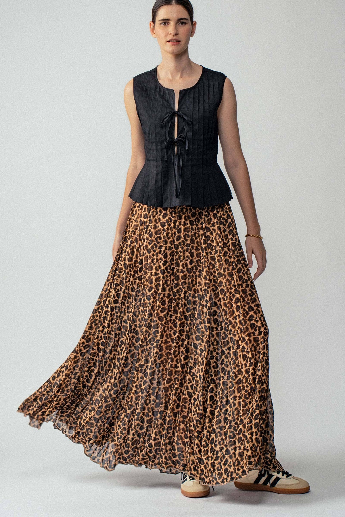 Make a statement with this elegant leopard print midi skirt featuring graceful pleats and a flattering A-line silhouette. The fluid polyester fabric creates beautiful movement while the elastic waistband ensures all-day comfort. Perfect for both dressy occasions and elevated casual wear.