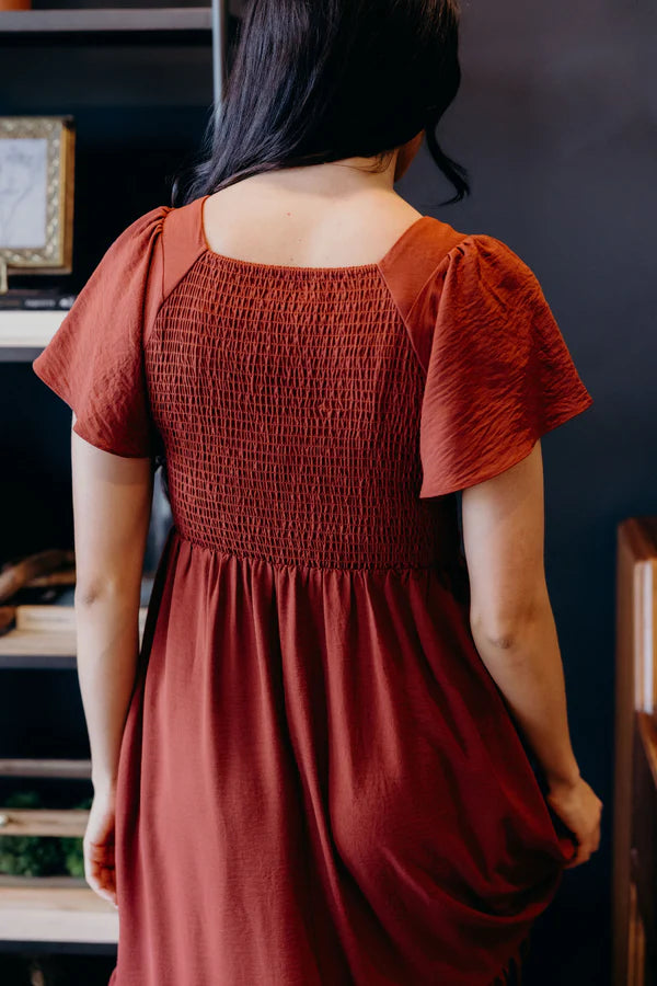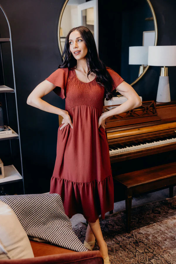This midi-length dress features a smocked bodice that ensures a comfortable, flattering fit, complemented by a feminine V neckline and flutter sleeves for added elegance. The ruffle hem adds a playful touch to the silhouette, making it perfect for both casual and dressier occasions. Crafted from 100% polyester, the fabric offers durability and easy care while maintaining a soft, lightweight feel. The warm Tandoori Spice color enhances its versatile appeal, making this dress a stylish addition to any wardrobe.